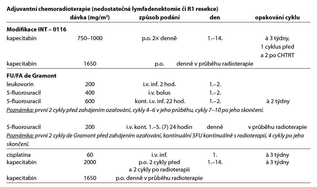 - adjuvantní chemoradioterapie není indikována u pacientů, kteří podstoupili adekvátní chirurgický výkon s R0 resekcí, avšak v případě nedostatečného chirurgického výkonu (nedostatečná lymfadenektomie či R1 resekce) je možné dle studie INT0116 zvážit adjuvantní radioterapii s využitím fluorouracilu a leukovorinu (studie Intergroup update po 10 letech, ASCO 2009 prokázala zlepšení OS (HR=1,32) a DFS (HR=1,51) (2A).
