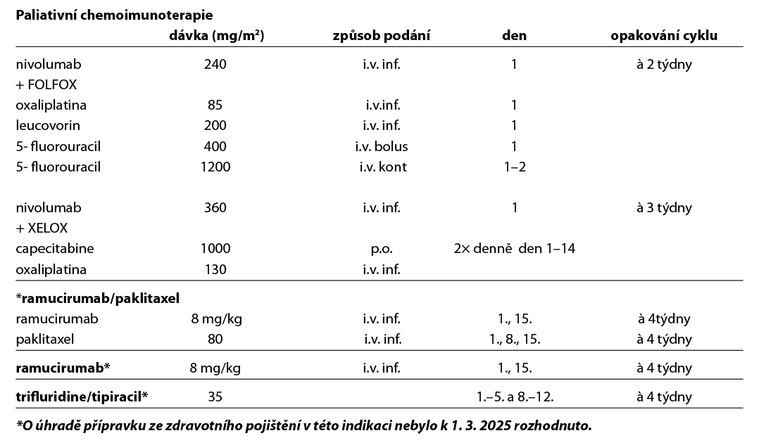 Kombinace fluoropyrimidinu a oxaliplatiny s nivolumabem je léčebným standardem pro pacienty s PD-L1 expresi CPS≥5 s dosaženým mediánem OS 14,4 versus 11,1 měsíce, HR 0,71 [98,4% CI 0,59–0,86]; p<0,0001. Podobně, recentně publikovaná studie fáze 3 KEYNOTE-859 prokázala statisticky významné zlepšení přežití u pacientů léčených režimem pembrolizumab* plus chemoterapie fluoropyrimidinem a platinou oproti režimu chemoterapie/placebo v první linii léčby u HER2 negativního, lokálně pokročilého, neresekovatelného nebo metastazujícího adenokarcinomu žaludku nebo gastroezofageálního spojení. V populaci PD-L1 CPS ≥1 byl medián OS 13,0 měsíce (95% CI 11,6-14,2) pro pembrolizumab-CHT oproti 11,4 měsíce (95% CI 10,5-12,0) pro placebo-CHT (HR 0,74, 95% CI 0,65-0,84; P <0,0001). V populaci PD-L1 CPS≥10 byl medián OS 15,7 měsíce (95% CI 13,8-19,3) u pembrolizumabu-ChT oproti 11,8 měsíce (95% CI 10,3-12,7) u placebo-ChT (HR 0,65, 95% CI 0,53-0,79; P <0,0001). *Tislelizumab v kombinací s chemoterapií je dalším checkpoint inhibitorem, který je doporučen EMA u populace pacientů s HER2 negativním PD-L1 TAP≥ 5 (tumor area pozitivity).
