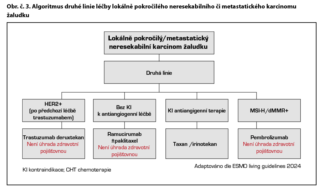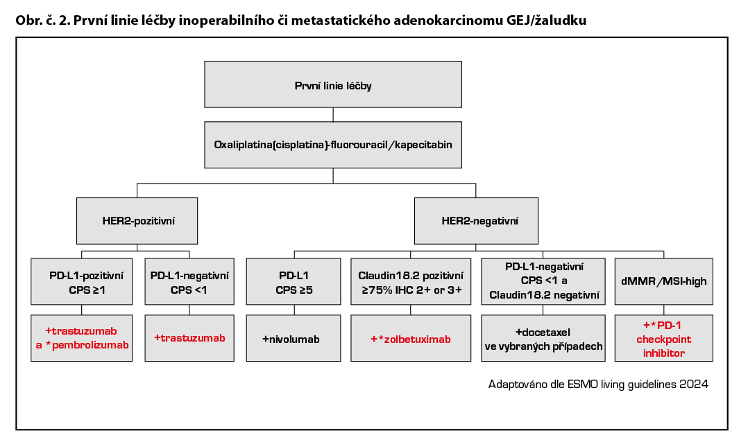 U HER2 pozitivních adenokarcinomů GEJ a žaludku je po progresi po předchozí léčbě režimem založeném na trastuzumabu indikován *trastuzumab deruxtekan (T-DXd). Ve studii Destiny-Gastric01 u asijské populace bylo celkové přežití delší s trastuzumab deruxtekanem než s chemoterapií (medián 12,5 vs. 8,4 měsíce; poměr rizik pro úmrtí, 0,59; 95% CI, 0,39 až 0,88; P = 0,01). Podobně i u západní populace prokázal T-DXd klinickou účinnost a zvládnutelný bezpečnostní profil u HER2+ neresekovatelného/metastatického onemocnění po selhání na předchozí léčbě trastuzumabem a byl v této indikaci rovněž schválen EMA.