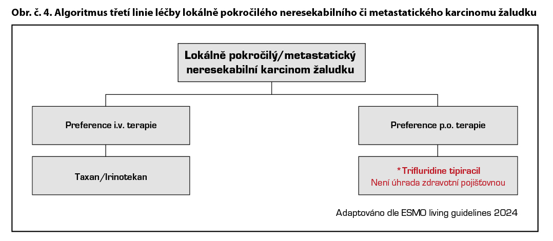 Trifluridine/tipiracil* je cytostatická kombinace antimetabolitu trifluridinu a inhibitoru thymidinfosforylázy tipiracilu, jehož účinnost a bezpečnost byla zhodnocena studií III. fáze (TAGS) u pacientů s metastazujícím karcinomem žaludku (včetně adenokarcinomu gastroesofageální junkce), kteří byli dříve léčeni alespoň dvěma režimy systémové terapie pro pokročilé stádium onemocnění zahrnující chemoterapii založenou na fluoropyrimidinu, platině a buď taxanu nebo irinotekanu, spolu s odpovídající terapií anti HER2. Trifluridine/tipiracil vedl ke statisticky signifikantnímu zlepšení OS (medián OS 5,7 měsíce vs 3,6 měsíce v rameni s placebem; HR 0,69 (95 % CI: 0,56, 0,85; p = 0,0003)).