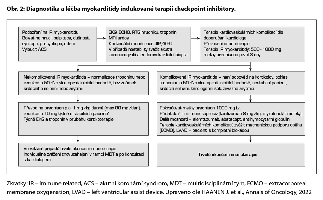 pokles EFLK, jiné imunitně podmíněné AE, MRI suspektní nález – pouze některé modifikovaná Lake Louise kritéria). Diagnostika a léčba myokarditidy indukované checkpoint inhibitory je zobrazena na Obr. 2.