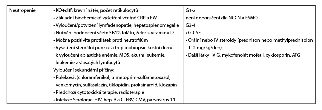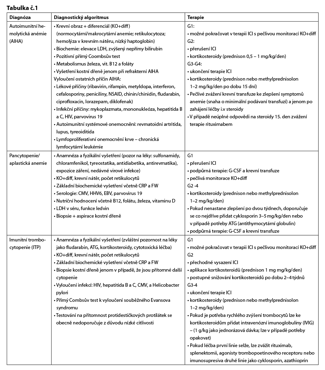 Závažná imunitně podmíněná (IR, immune related) hematologická toxicita je relativně vzácná (< 5 %), ale může být spojena s významnou mortalitou. Medián doby do nástupu IR-hematologické toxicity u kombinované imunoterapie je kratší než u monoterapie (12 oproti 25 týdnů). Doposud nejsou známe jasné predisponující rizikové faktory. U pacientů se základními hematologickými poruchami, jako je např. chronická lymfocytární leukémie léčených checkpoint inhibitory (ICI), byl pozorován vyšší výskyt hemolytické anémie. Diagnostický algoritmus a terapie klíčových IR – hematologických toxicit jsou shrnuté v tabulce č. 1. U závažných stupních toxicity (stupně ≥ 3) je nutná úzká spolupráce s hematologem.