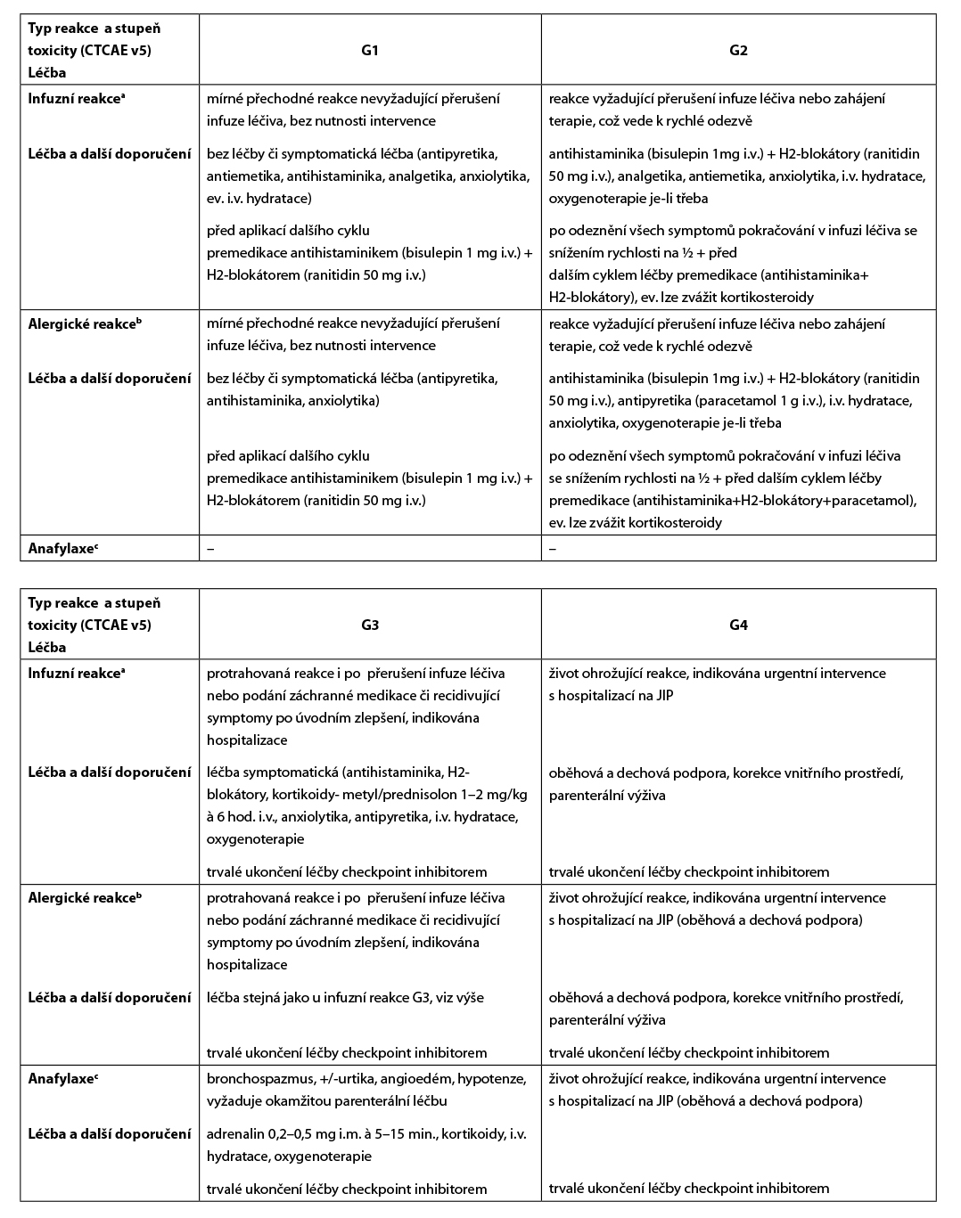 - incidence výskytu infuzních reakcí při podávání checkpoint inhibitorů je velmi nízká (méně než 1 % nežádoucích účinků v klinických studiích fáze III), většina z nich jsou mírné a střední intenzity (G1 a G2), nejčastěji se klinicky vyskytují subfebrilie až febrilie, zimnice, cefalea a nauzea,