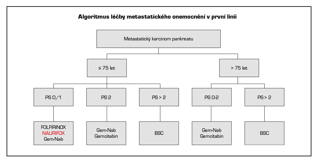 - U nemocných PS 0-2 je vhodné zahájení paliativní CHT bezprostředně po potvrzení diagnózy, CHT není možné zahájit bez histologické, ev. cytologické verifikace. Nicméně v případě, kdy se bioptická verifikace karcinomu 2× po sobě nezdaří, ale klinický nález, nález na CT a hladina nádorového markeru CA 19-9 odpovídají diagnóze PDAC, není dle recentních ESMO guidelines další biopsie indikována a je možné začít s onkologickou léčbou.