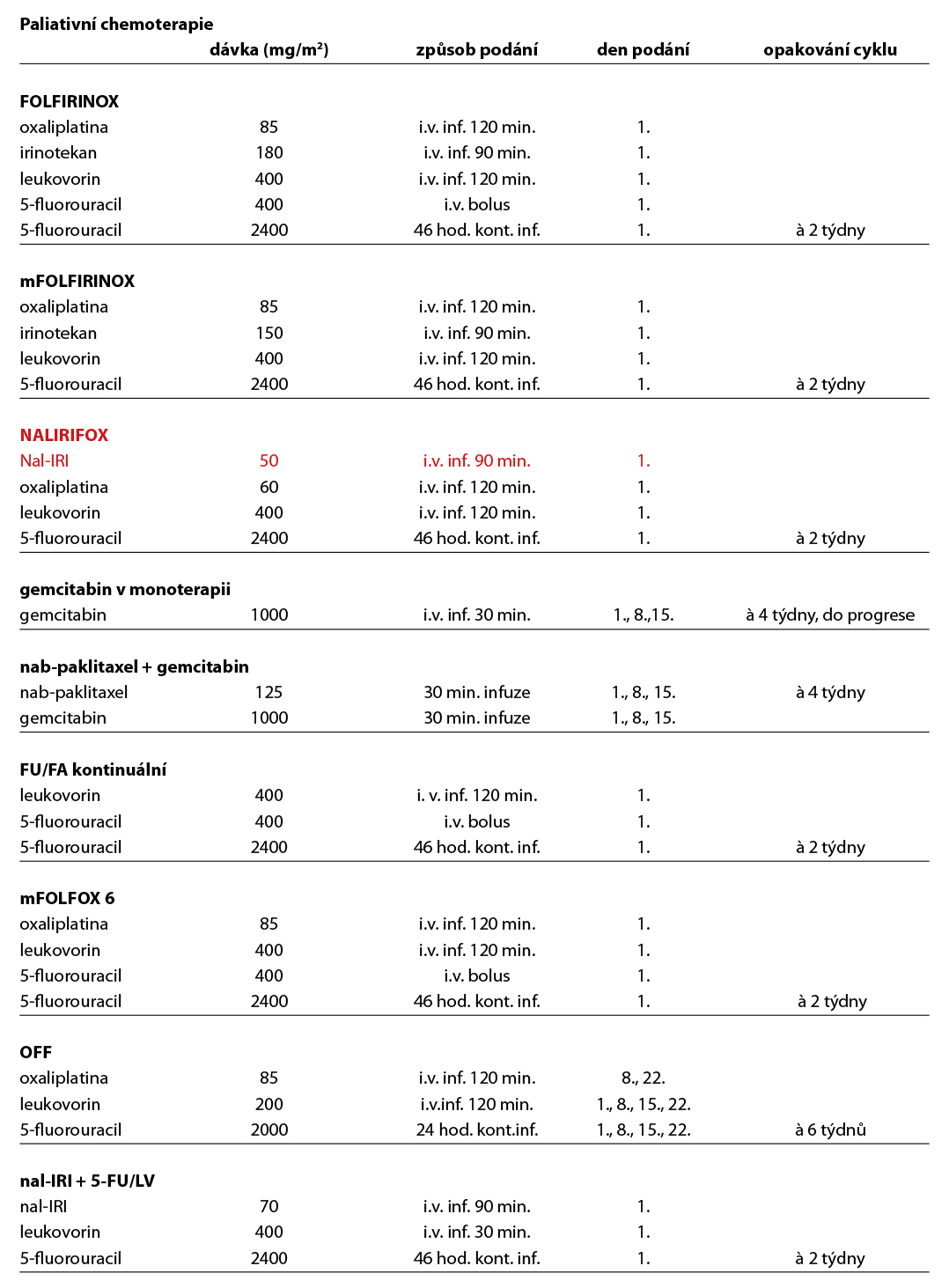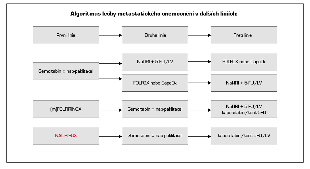- Nali-IRI (pegylovaný lipozomální irinotekan) v kombinaci s 5-FU a leukovorinem prokázal benefit v přežití oproti chemoterapii 5-FU/leukovorin samotné a je indikován ve druhé a dalších liniích léčby při progresi po terapii založené na gemcitabinu. Medián OS: 6,1 vs 4,2 měs., HR 0,67 (95 % CI: 0,49-0,92; p=0,012).