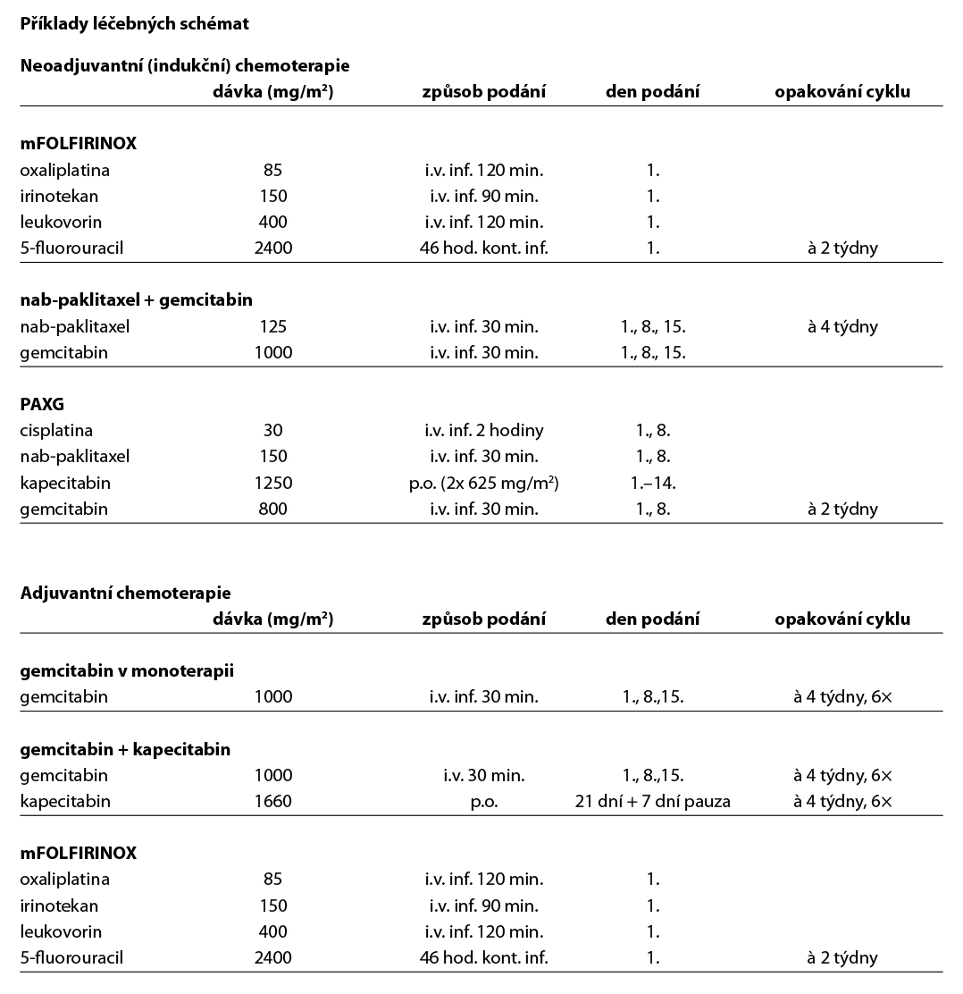 - Po radikální operaci je doporučena adjuvantní chemoterapie (CHT) po dobu 6 měsíců. U pacientů v dobrém celkovém stavu (PS 0-1) je režimem první volby mFOLFIRINOX (dle výsledků studie PRODIGE 24/CCTG PA.6), který oproti gemcitabinu prokázal výrazné prodloužení mediánu celkového přežití (medián OS 54,4 vs 34,8 měsíců) a přežití bez známek onemocnění (medián DFS 21,6 vs 12,8 měsíců). U pacientů v horším celkovém stavu nebo ve věku nad 75 let zůstává standardem gemcitabin v monoterapii, případně režim gemcitabin + kapecitabin (nicméně vzhledem k toxicitě je využití velmi omezené).