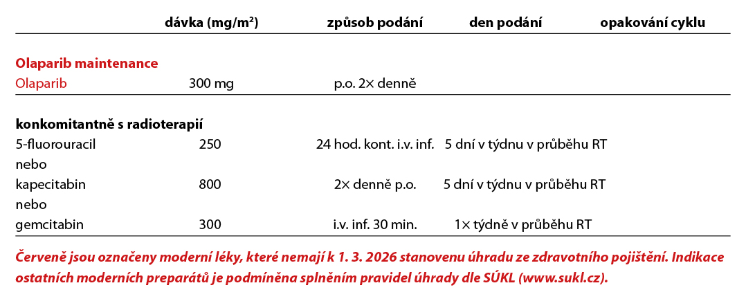 - Maintenance terapie Olaparibem je indikována u pacientů v dobrém celkovém stavu (PS 0-1) s prokázanou germinální mutací BRCA1/2 při absenci progrese po minimálně 16 týdnech iniciální chemoterapie s platinovým derivátem (např. FOLFIRINOX). Olaparib oproti placebu signifikantně prodloužil medián PFS (7,4 vs 3,8 měs., HR 0,53, p = 0,004) (1).