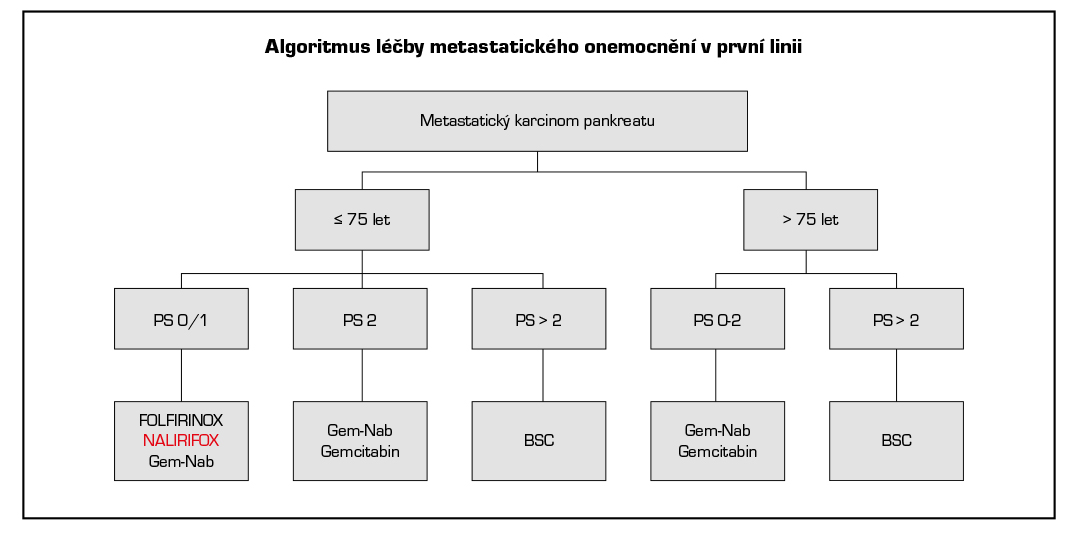- U nemocných PS 0-2 je vhodné zahájení paliativní CHT bezprostředně po potvrzení diagnózy, CHT není možné zahájit bez histologické, ev. cytologické verifikace. Nicméně v případě, kdy se bioptická verifikace karcinomu 2× po sobě nezdaří, ale klinický nález, nález na CT a hladina nádorového markeru CA 19-9 odpovídají diagnóze PDAC, není dle recentních ESMO guidelines další biopsie indikována a je možné začít s onkologickou léčbou.