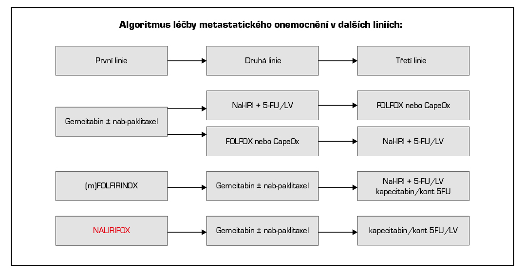 - Nali-IRI (pegylovaný lipozomální irinotekan) v kombinaci s 5-FU a leukovorinem prokázal benefit v přežití oproti chemoterapii 5-FU/leukovorin samotné a je indikován ve druhé a dalších liniích léčby při progresi po terapii založené na gemcitabinu. Medián OS: 6,1 vs 4,2 měs., HR 0,67 (95 % CI: 0,49-0,92; p=0,012).