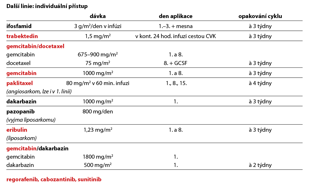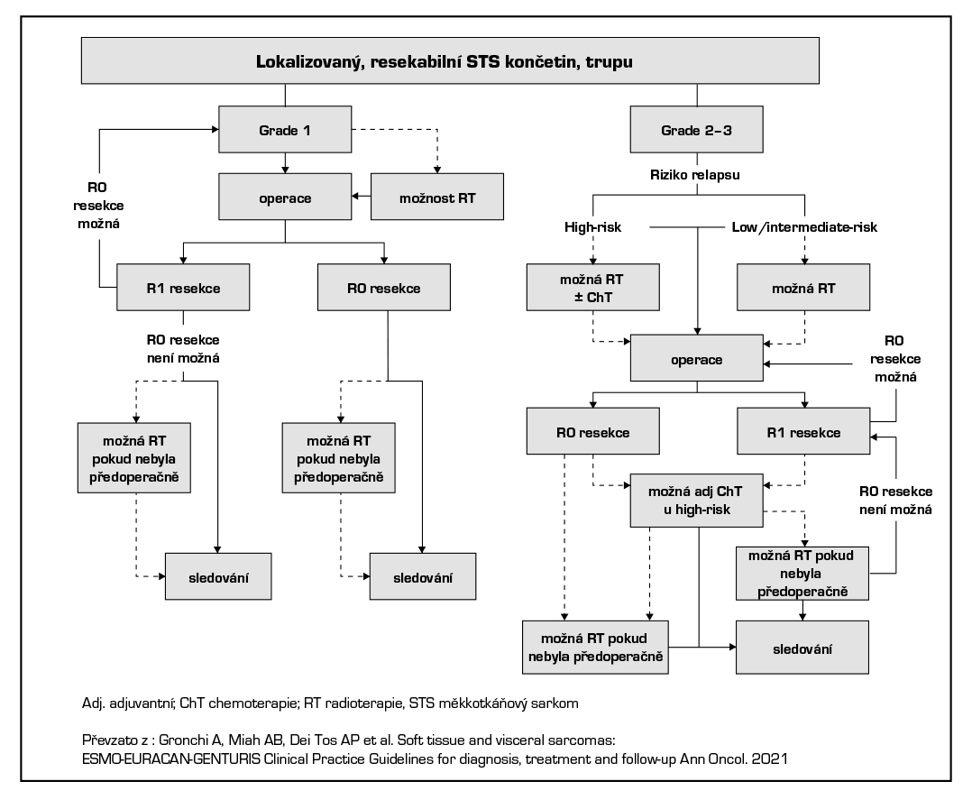 – adjuvantní chemoterapie není standardním léčebným postupem, pro HG sarkomy končetinové/trupu větší než 5 cm s předpokládanou chemosenzitivitou a s predikovaným desetiletým OS pod 60 % dle prognostických nomogramů vhodná,