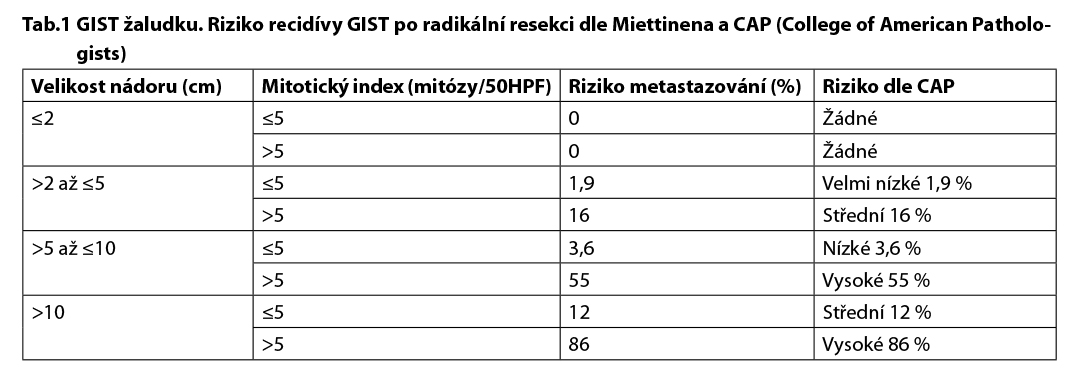 Pacienti s nízkým a velmi nízkým rizikem recidivy by neměli podstoupit adjuvantní léčbu imatinibem. Mutační analýza je nutná k predikci sensitivity na cílenou léčbu a prognózy.
