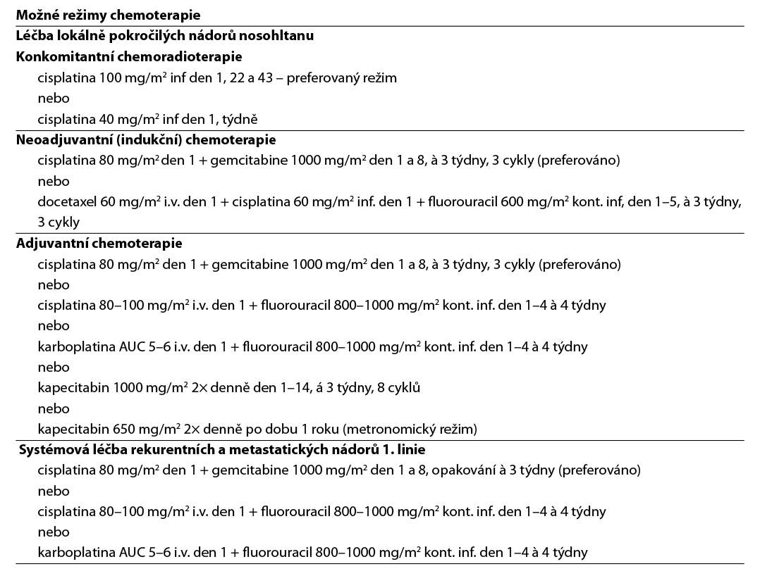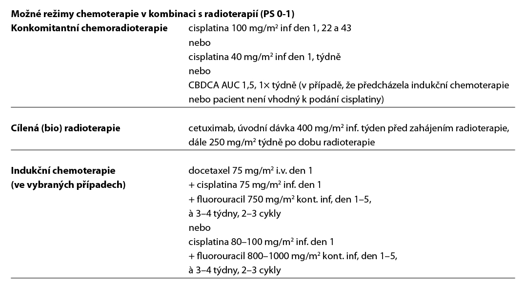 Chemoradioterapie – jako konkomitantní režim chemoterapie je preferována cisplatina v monoterapii. Indikaci konkomitantní chemoterapie je nutné zvážit s ohledem na celkový biologický stav pacienta (PS 0–1) a vedlejší onemocnění. Metaanalýzy neprokázaly přínos přidání chemoterapie u pacientů ve věku nad 70 let.