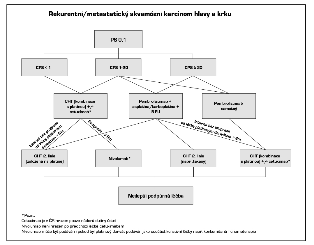 Studie Keynote 048 prokázala efekt imunoterapie v léčbě metastatického onemocnění a vedla k úhradě pembrolizumabu v monoterapii nebo v kombinaci s chemoterapií založenou na platině a fluoruracilu (5-FU) v první linii léčby metastazujícího nebo neresekovatelného recidivujícího skvamózního karcinomu hlavy a krku u dospělých pacientů s ECOG je 0–1, a to v případě exprese PD-L1 s CPS ≥1. Maximální délka léčby je 24 měsíců. V případě CPS <1 či kontraindikace imunoterapie je léčebnou alternativou režim studie EXTREME (kombinace cisplatina (nebo karboplatina) – 5-fluorouracil – cetuximab), jehož použití vede k prodloužení celkového přežití proti samostatné chemoterapii, (medián OS 10,1 vs 7,4 měsíce). Alternativou je režim TPEx (cisplatina + docetaxel + cetuximab), který má srovnatelnou účinnost s režimem EXTREME při lepší komplianci a nižší toxicitě. Použití režimu s cetuximabem je v ČR hrazeno pouze u nádorů dutiny ústní. Pokud došlo k progresi nádoru během nebo do 6 měsíců po chemoterapii s platinovým derivátem pro metastatický/rekurentní skvamózní karcinom nebo po kombinované léčbě s platinovým derivátem (např. chemoradioterapii), je možné indikovat nivolumab v dávce 240 mg à 2 týdny. Randomizovaná studie fáze III CheckMate 141 prokázala účinnost nivolumabu ve druhé linii. V ČR není nivolumab hrazen po předchozí léčbě režimem s cetuximabem.