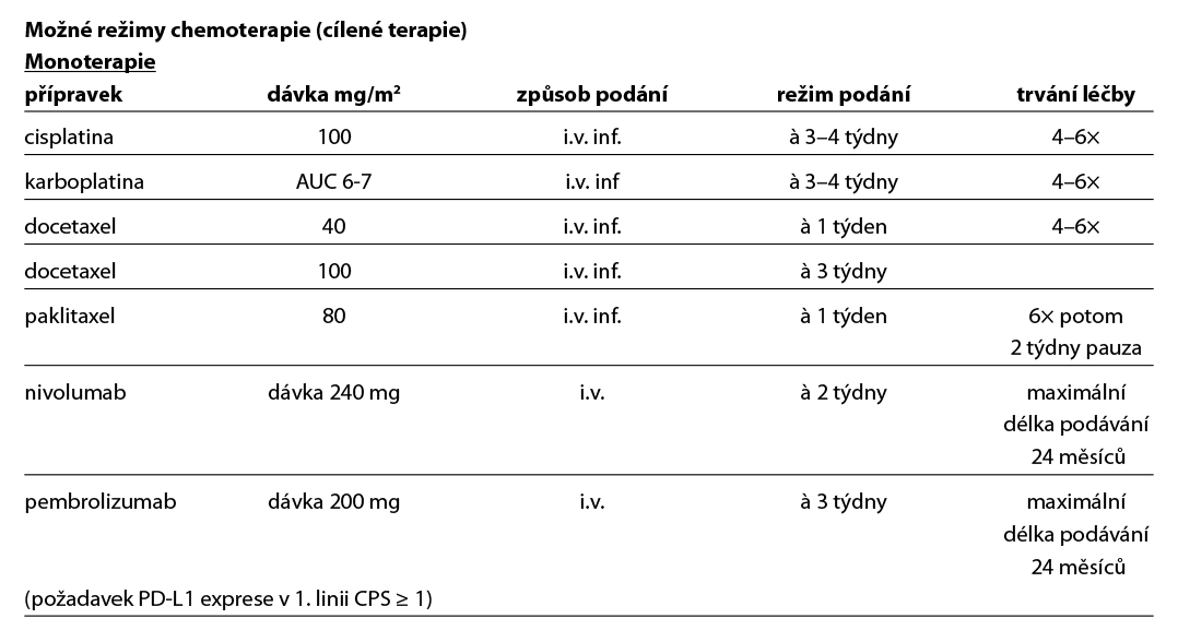 – konkomitantní chemoradioterapie bez adjuvantní chemoterapie, případně samostatná radioterapie – lze akceptovat u pacientů s horší tolerancí chemoterapie.