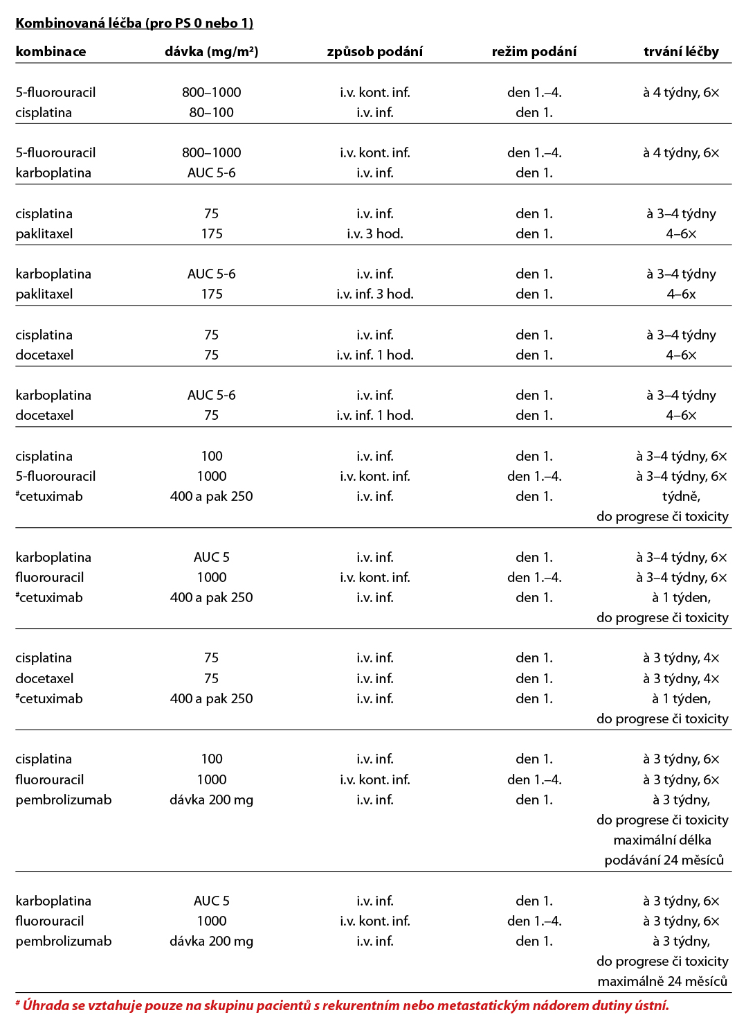 – v kombinaci s chemoterapií na bázi platiny k léčbě relabujícího a/nebo metastazujícího onemocnění (pro skupinu pacientů s relabujícím anebo metastatickým nádorem ústní dutiny, jejichž Karnofsky performance skóre je ≥ 90). Léčba cetuximabem je hrazena do progrese onemocnění.