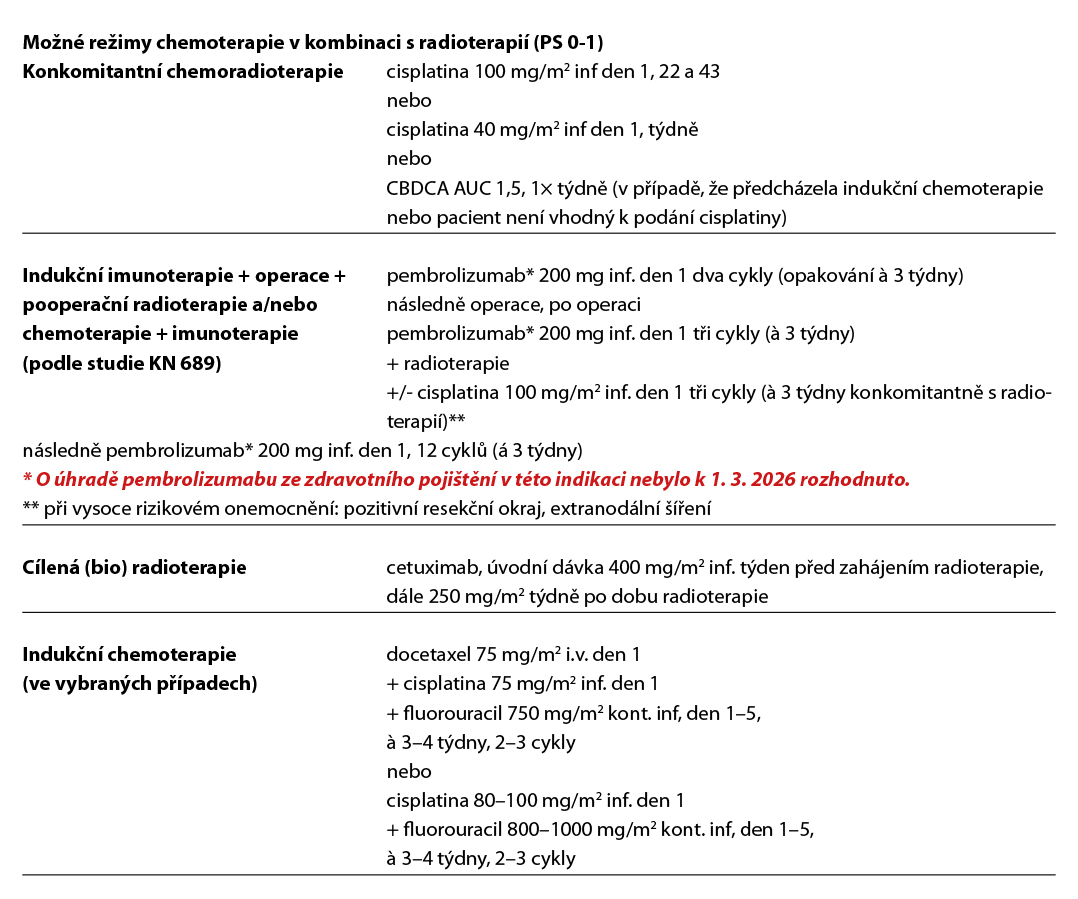 - indukční chemoterapie + s následnou radioterapií samotnou nebo v konkomitanci s chemoterapií či cetuximabem. Tento postup nutno zvažovat individuálně – např. při primárně rozsáhlém uzlinovém postižení N3 s nutností okamžité léčby.