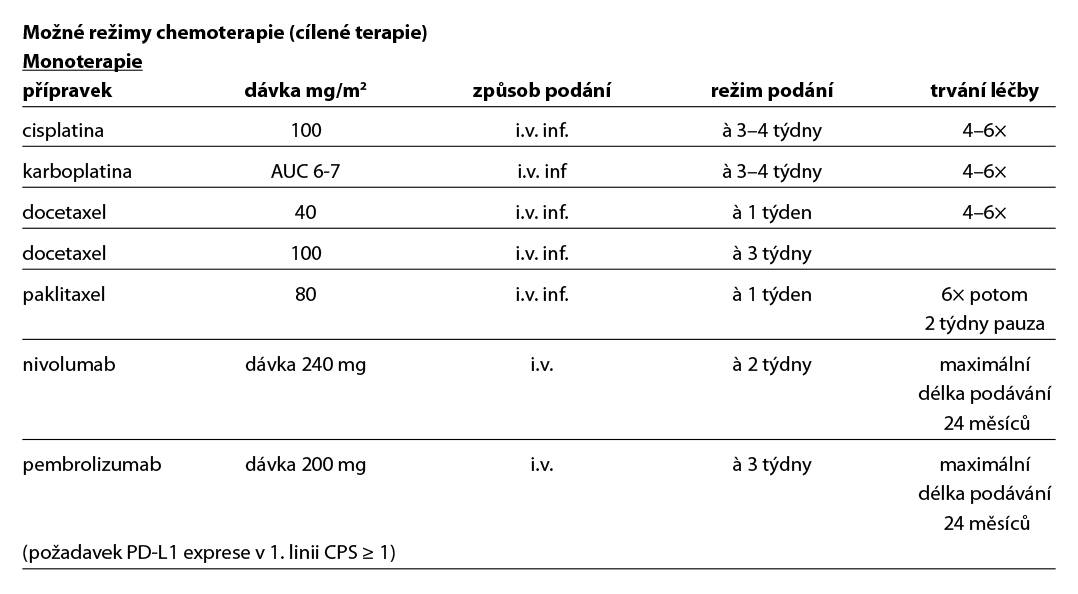 - konkomitantní chemoradioterapie bez adjuvantní chemoterapie, případně samostatná radioterapie – lze akceptovat u pacientů s horší tolerancí chemoterapie.