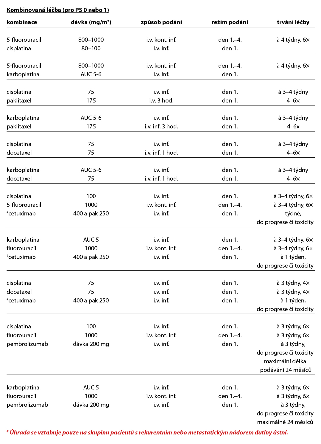 - v kombinaci s chemoterapií na bázi platiny k léčbě relabujícího a/nebo metastazujícího onemocnění (pro skupinu pacientů s relabujícím anebo metastatickým nádorem ústní dutiny, jejichž Karnofsky performance skóre je ≥ 90). Léčba cetuximabem je hrazena do progrese onemocnění.