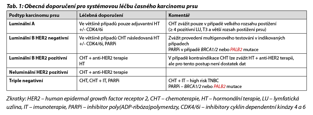 Pacientky s HER2 pozitivním karcinomem po primárním operačním výkonu (I. klinické stádium) by měly být adjuvantně léčeny kombinací CHT a anti-HER2 terapie. Pacientky vyšších klinických stádií jsou ve většině případů léčeny NAT. Pacientky s TNBC by měly být ve většině případů po primárním operačním výkonu (pT1a, pT1b) léčeny CHT. U pacientek s větším rozsahem onemocnění (≥ cT1c a vyšší, N+) je preferována NAT; CHT (cT1c) nebo kombinace CHT + imunoterapie (cT2 a vyšší). Pacientky s expresí ER < 10% (tzv. ER-low karcinomy) tvoří značně heterogenní populaci, avšak i u těchto pacientek je adjuvantní HT doporučena. U pacientek s expresí ER < 5 % klinického stádia II. je vhodné podání NAT (CHT + pembrolizumab). Konkrétní léčebný postup vychází vždy z doporučení MDT. U vysoce rizikových pacientek s TNBC, které jsou nosičkami germinální mutace BRCA1/2 nebo PALB2 je indikována léčba olaparibem (úhrada je stanovena pouze v případě BRCA1/2 mutace).