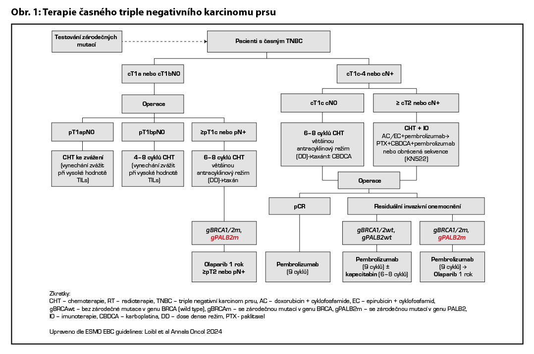 C – u triple negativních nádorů je adjuvantní CHT založena ve většině případů na antracyklinech a taxanech. U nádorů nízkého rizika lze zvážit podání pouze antracyklinového režimu (např. AC) nebo TC. U high risk pacientek léčených kombinací CHT + pembrolizumab v rámci NAT je indikováno pokračování pembrolizumabem v monoterapii (9 cyklů à 3 týdny i.v. nebo s.c. bez ohledu na efekt neoadjuvantní terapie). V individuálních případech (toxicita léčby) lze u pacientek s pCR adjuvantní terapii pembrolizumabem nepodat. V případě reziduálního postižení po NAT zvážit u pacientek s gBRCAwt/gPALB2wt konkomitantní podání pembrolizumabu a kapecitabinu (6–8 cyklů), u pacientek s gBRCAm/gPALB2m je indikováno podání pembrolizuzmabu a následně olaparibu na dobu 1 roku. U pacientek po primárním operačním výkonu (≥pT2N0 nebo pN+) s germinální mutací BRCA1/2 nebo PALB2 je indikováno podání olaparibu na dobu 1 roku. Adjuvantní CHT lze vynechat u nízce rizikových tumorů (sekretorický, adenoidně cystický karcinom). Vynechání adjuvantní chemoterapie lze individuálně zvažovat u pacientek s malými tumory s vysokou infiltrací tumor infiltrujících lymfocytů. Doporučený léčebný postup u pacientek s TNBC je výše na Obr. 1.