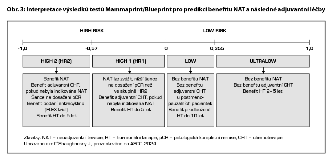 Neoadjuvantní terapie je vhodná u pacientek, u kterých lze očekávat odpověď na CHT/cílenou terapii/imunoterapii (nádory s nízkými nebo negativními HR, s vysokým gradem, karcinomy s vysokým Ki- 67, HER2+, TNBC). Dále je neoadjuvantní terapie volena u pacientek s lokálně pokročilým inoperabilním onemocněním, u pacientek s inflamatorním karcinomem prsu a u pacientek, u kterých lze v případě regrese postižení provést prs záchovný výkon a/nebo menší operační výkon v axile (cílená axilární disekce). Ke zhodnocení benefitu neoadjuvantní chemoterapie lze u pacientek s HR+/HER2karcinomy využít multigenových testů. Indikace vyšetření má stejná kritéria jako v rámci adjuvantní terapie a provedení vyšetřen je nutné schválit v rámci MDT v KOC. Pokud je vyšetření provedeno před operačním výkonem, není možné již jeho opakované provedení po provedení operace. V případě použití testu Oncotype DX lze největší benefit NAT očekávat u pacientek s vysokým RS ( ≥ 26, zejména > 30). U premenopauzálních pacientek může být benefit NAT i v případě nižšího RS (16 – 25), obdobně jako je tomu v případě benefitu adjuvantní terapie. V případě použití multigenového testu MammaPrint/BluePrint mají největší benefit z NAT pacientky zejména ve skupině high risk 2 (vyšší pravděpodobnost dosažení pCR) a následně ve skupině high risk 1 (pravděpodobnost dosažení pCR nižší než ve skupině high risk 2). U pacientek s nízkým a ultra nízkým rizikem není benefit NAT. Možné interpretace výsledků vyšetření MammaPrint/Blueprint pro využití v rámci NAT jsou uvedeny na Obr. 3