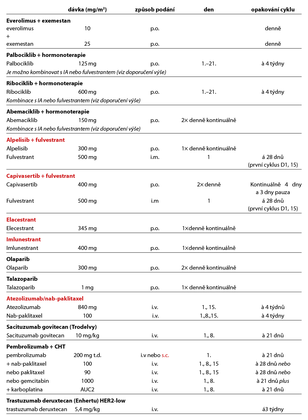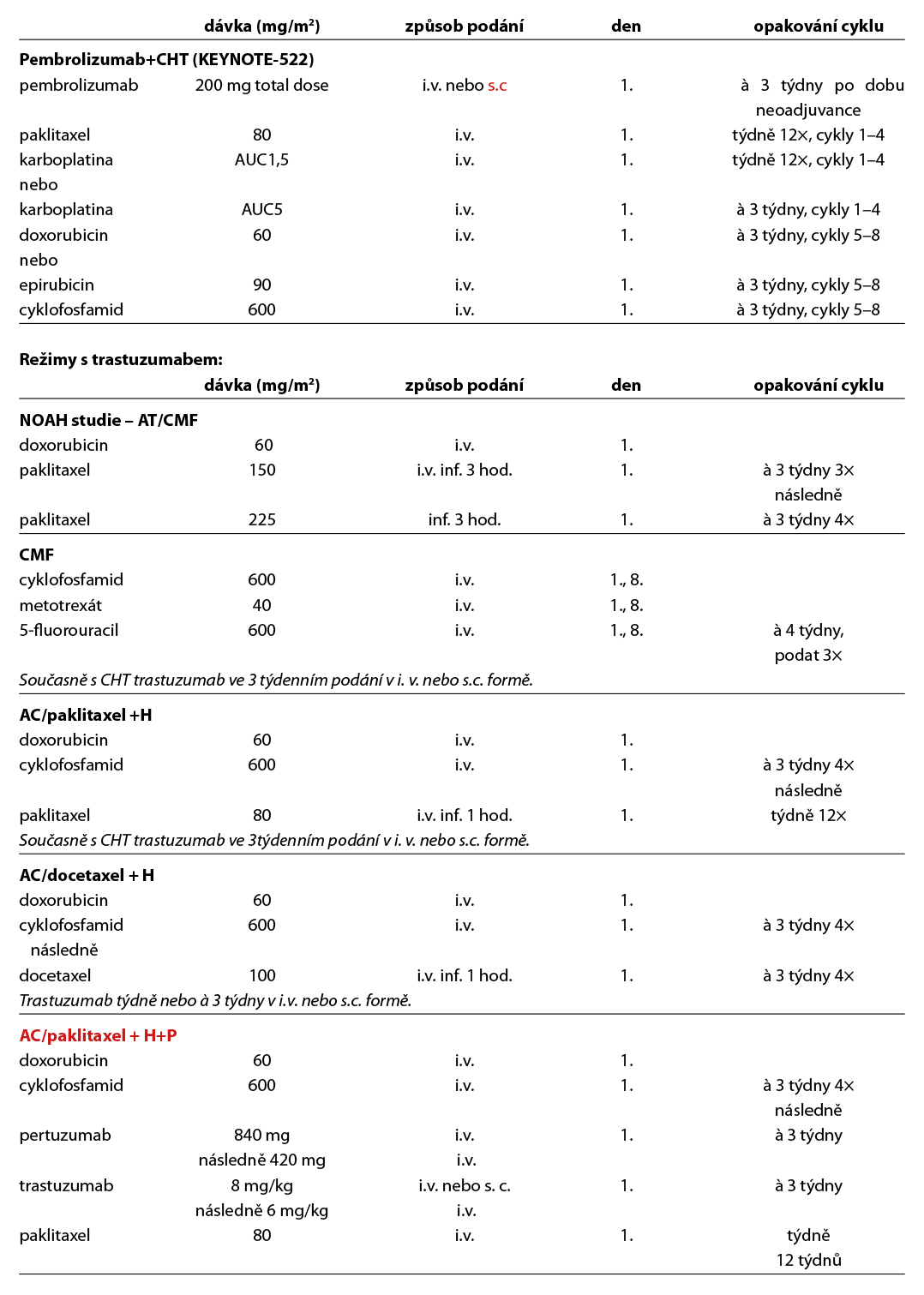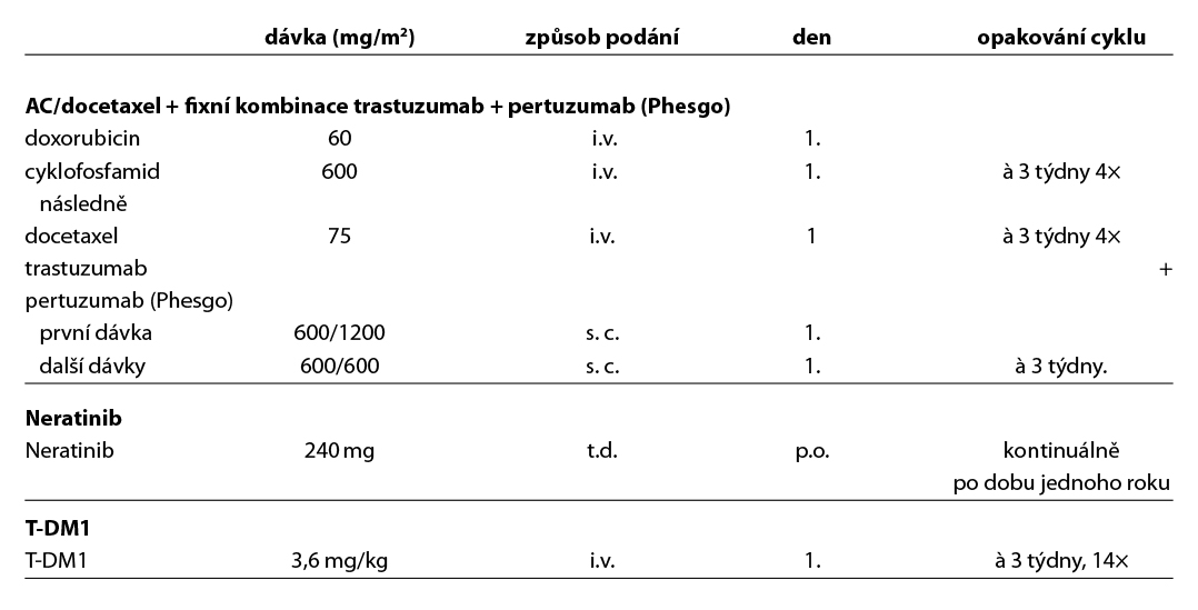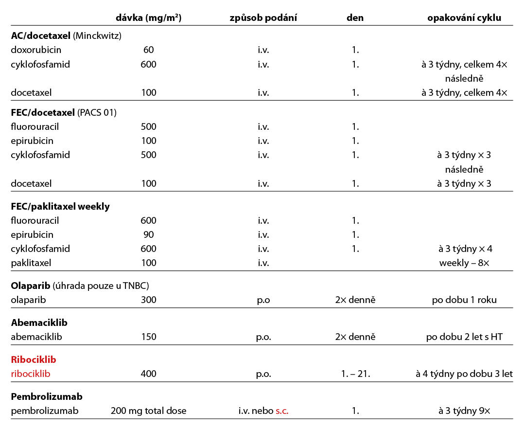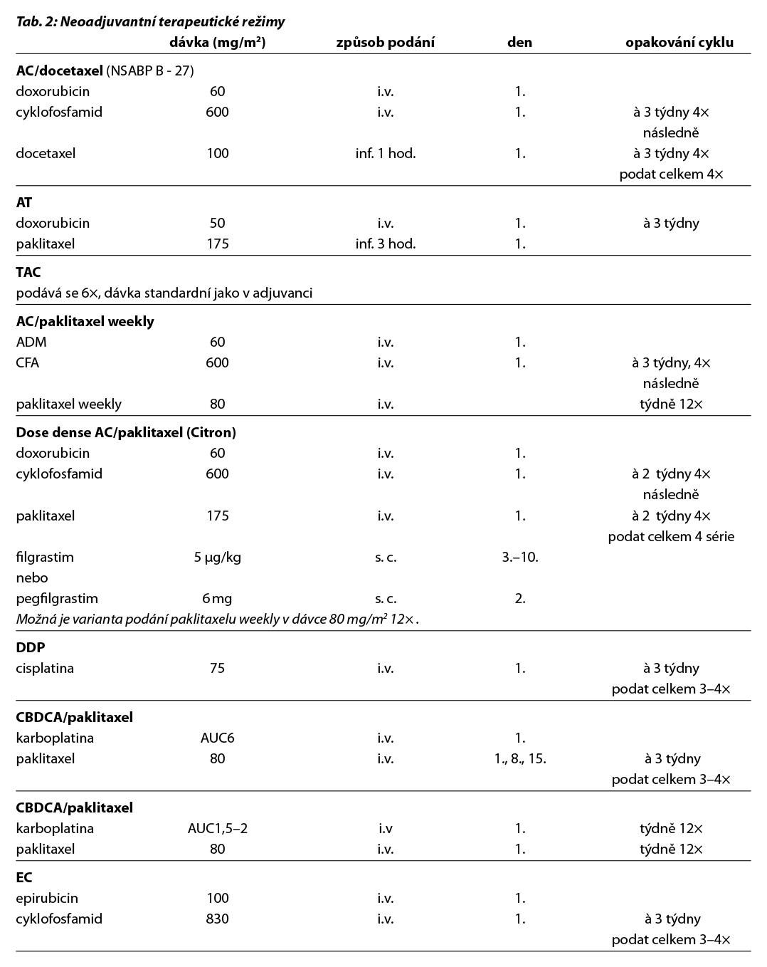 Před zahájením neoadjuvantní terapie je, v případě plánovaného prs záchovného výkonu nebo cílené axilární disekce, nutné zavedení klipu do nádoru v prsu a do bioptované axilární uzliny. Ve většině případů je volena sekvence antracyklinového režimu a taxánu nebo antracyklinového režimu a paklitaxelu s karboplatinou (pacientky s TNBC), podání dose-dense režimů je preferováno u všech podtypů. Možné je i podání neatracyklinových režimů, zvláště u pacientek s HER2 pozitivním karcinomem. Doporučuje se podat nejméně 6 cyklů CHT v rozmezí 4 až 6 měsíců. Veškerá plánovaná CHT by měla být podána před operací. U high-risk pacientek s TNBC ( cT2-4 a/nebo N+) je indikováno podání kombinace CHT a pembrolizumabu v i.v. nebo s.c. formě (KEYNOTE-522). Tato léčba zvyšuje pravděpodobnost dosažení pCR a zlepšuje dlouhodobé parametry léčebné odpovědi (EFS, OS). U pacientek s HER2 pozitivním karcinomem je standardem kombinace CHT a duální anti-HER2 terapie (NeoSphere, TRAIN2). Neoadjuvantní HT lze zvažovat u pacientek, u kterých není indikována neoadjuvantní ani adjuvantní CHT, a u kterých lze očekávat odpověď na HT (nádory s vysoce pozitivními HR, s nízkým gradem, s nízkým proliferačním indexem Ki67). U premenopauzálních pacientek je preferována kombinace ovariální suprese (OFS)+IA, u postmenopauzálních pacientek terapie inhibitorem aromatázy (IA). Doporučená doba podávání je 6–8 měsíců. Neoadjuvantní režimy jsou uvedeny v Tab. 2.
