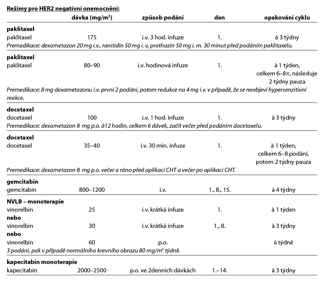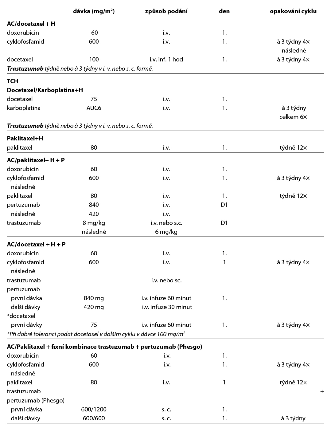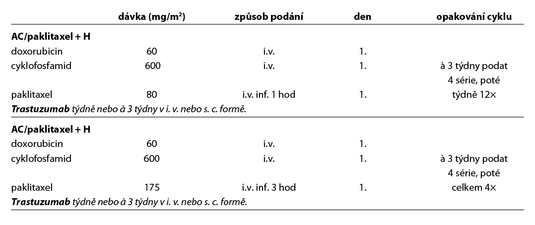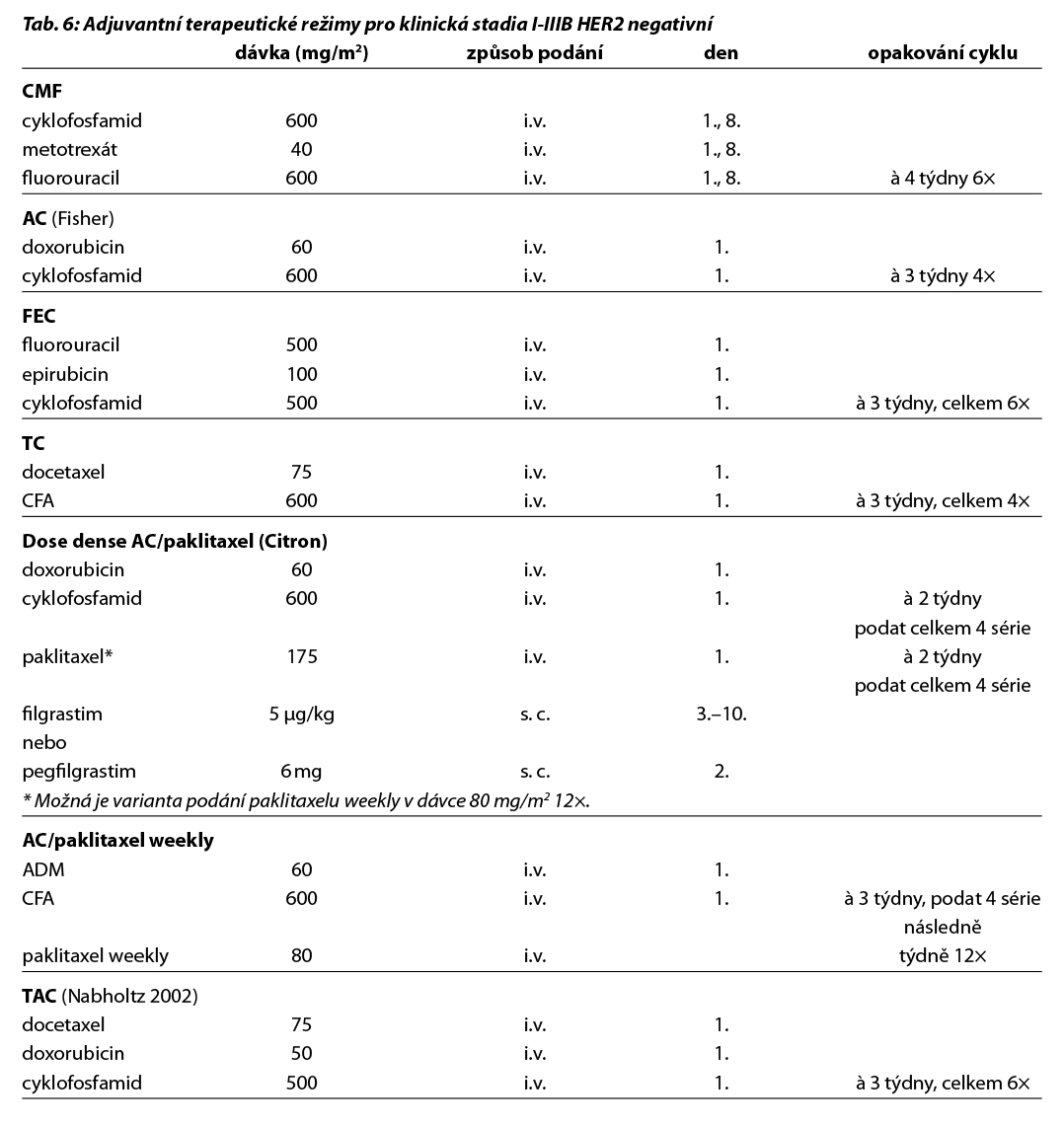 Nejčastější kombinace cytostatik jsou uvedeny v Tab. 5. Taxany v adjuvantní léčbě je možné podat v následujících kombinacích: AC-T (doxorubicin, cyklofosfamid 4×, paklitaxel 4× à 21 dní, preferovaný paklitaxel weekly 12×), v kombinaci AC-D (ADM, CFA 4×, následně docetaxel 4× vše à 21 dní), TAC (docetaxel, doxorubicin, cyklofosfamid 6×), 4–6× TC (docetaxel, cyklofosfamid), v režimu 4× FEC 100 – paklitaxel weekly 100 mg/m2 8× nebo v režimu – 3× FEC 100 a 3× docetaxel (PACS 01).