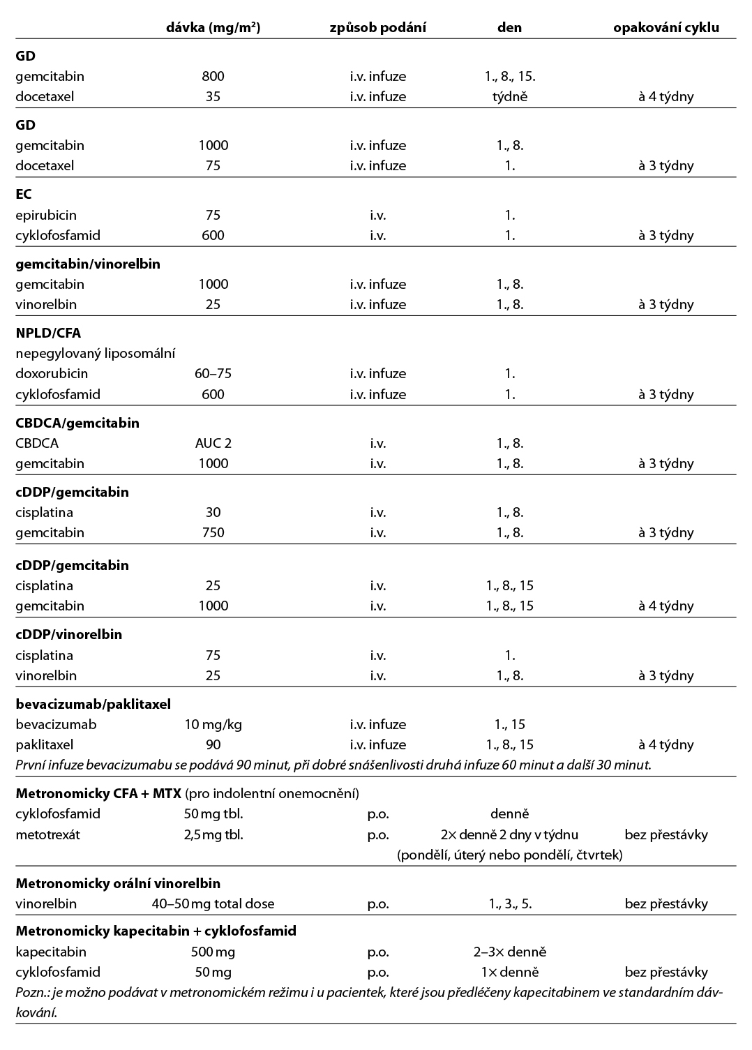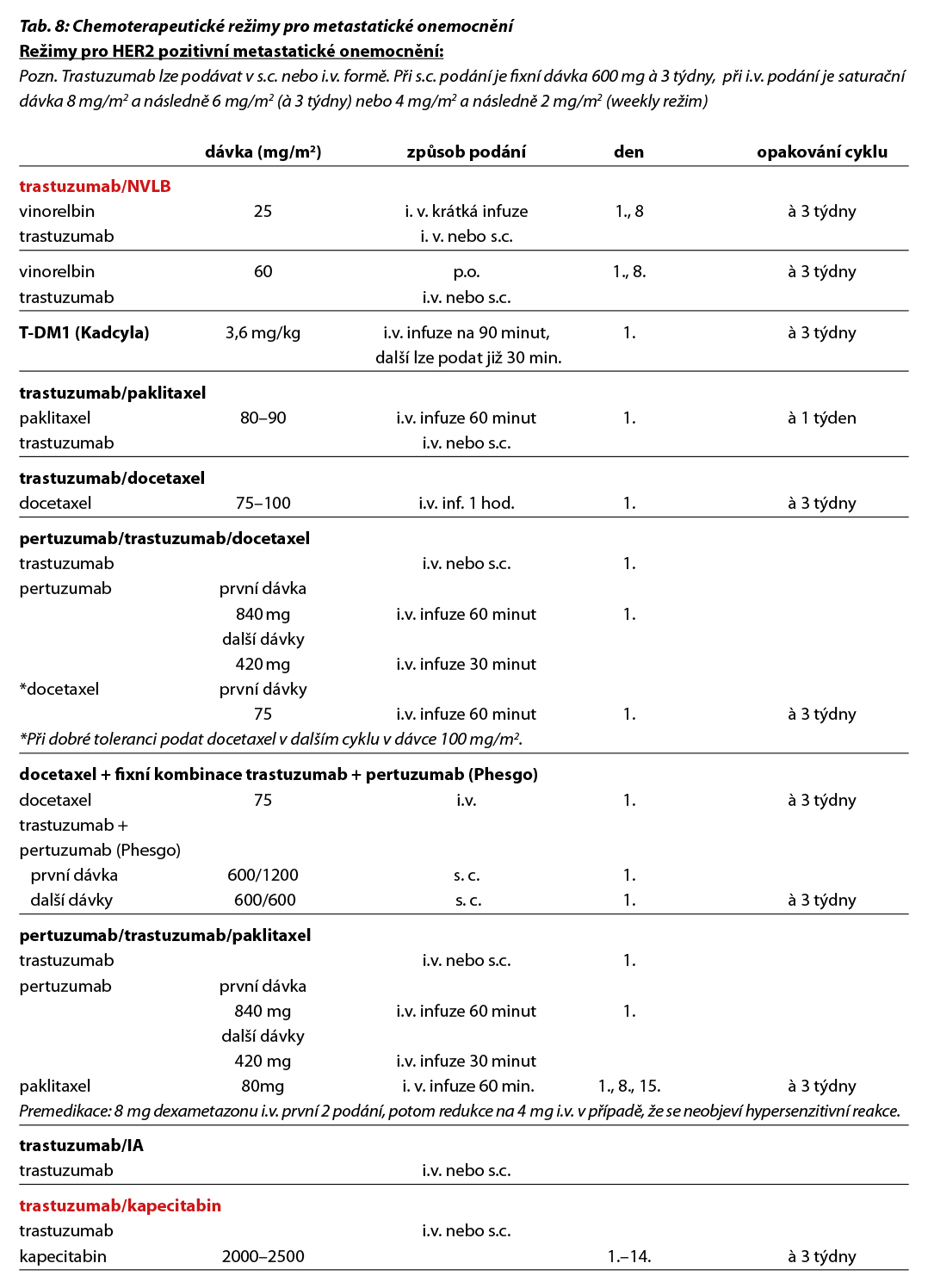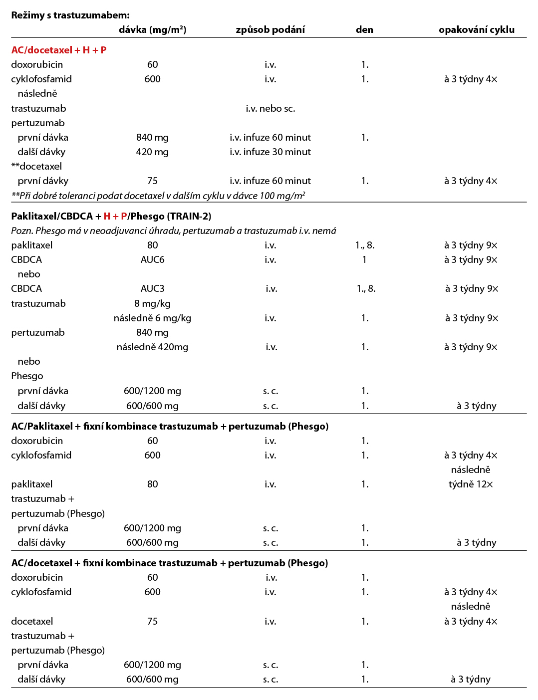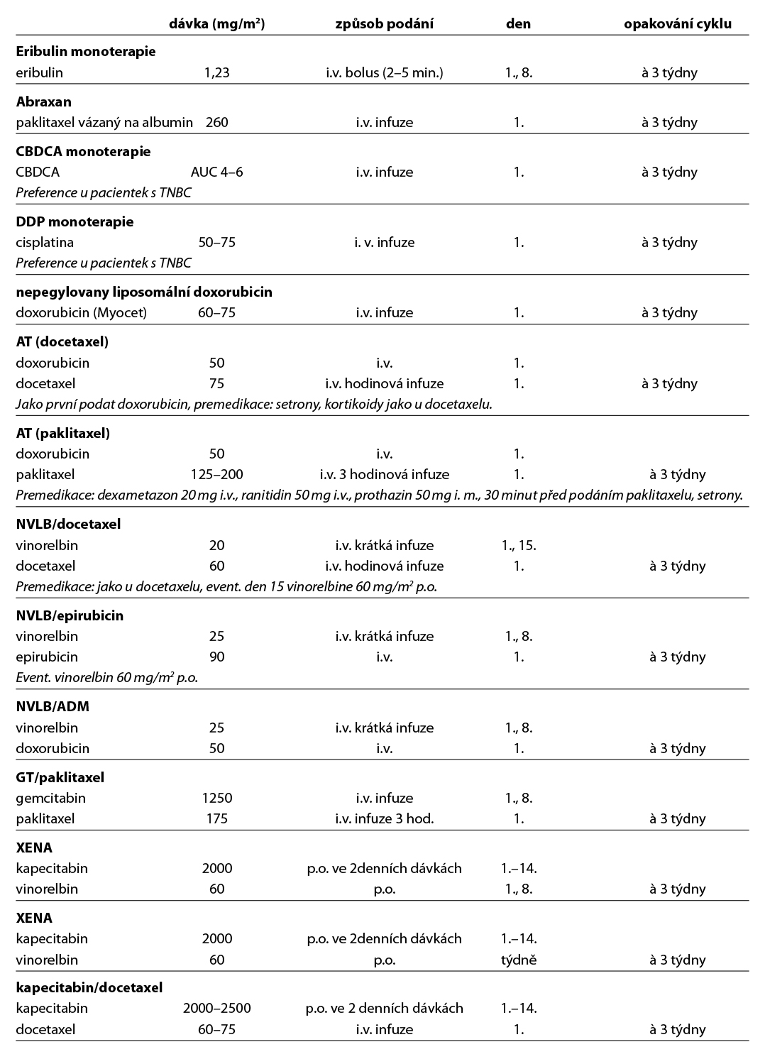 Nejčastější kombinace cytostatik jsou uvedeny v Tab. 5. Taxany v adjuvantní léčbě je možné podat v následujících kombinacích: AC-T (doxorubicin, cyklofosfamid 4×, paklitaxel 4× à 21 dní, preferovaný paklitaxel weekly 12×), v kombinaci AC-D (ADM, CFA 4×, následně docetaxel 4× vše à 21 dní), TAC (docetaxel, doxorubicin, cyklofosfamid 6×), 4–6× TC (docetaxel, cyklofosfamid), v režimu 4× FEC 100 – paklitaxel weekly 100 mg/m2 8× nebo v režimu – 3× FEC 100 a 3× docetaxel (PACS 01).