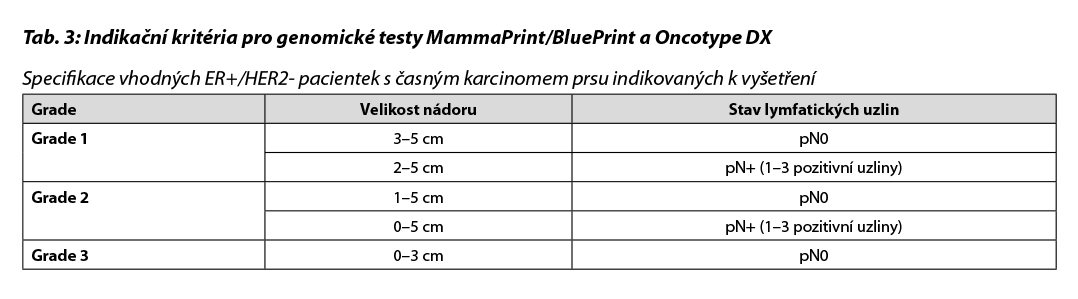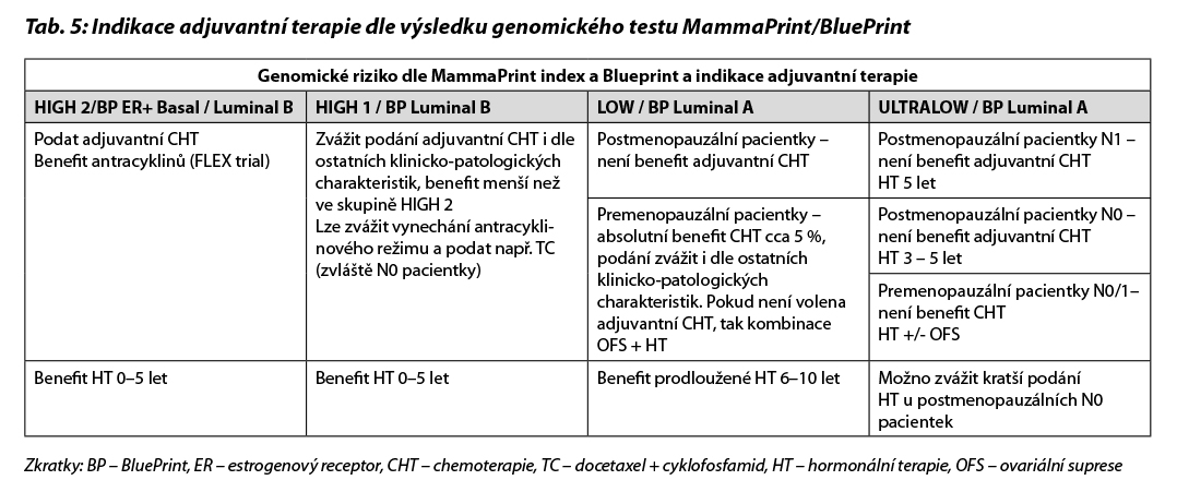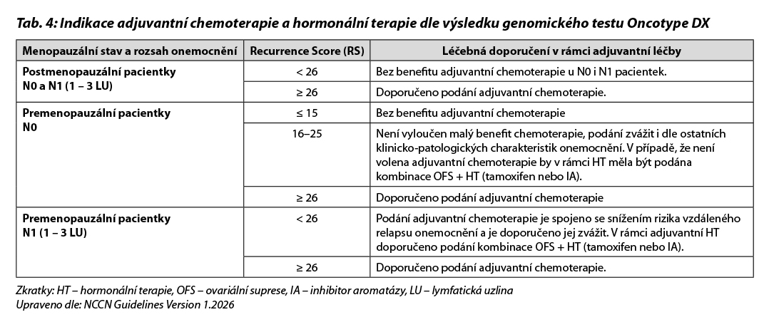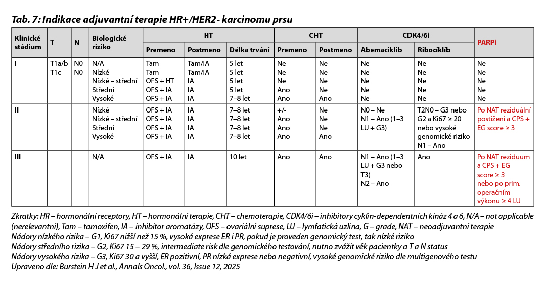 Indikace adjuvantní terapie u pacientek s HR+/HER2- karcinomy je uvedena v Tab. 7.