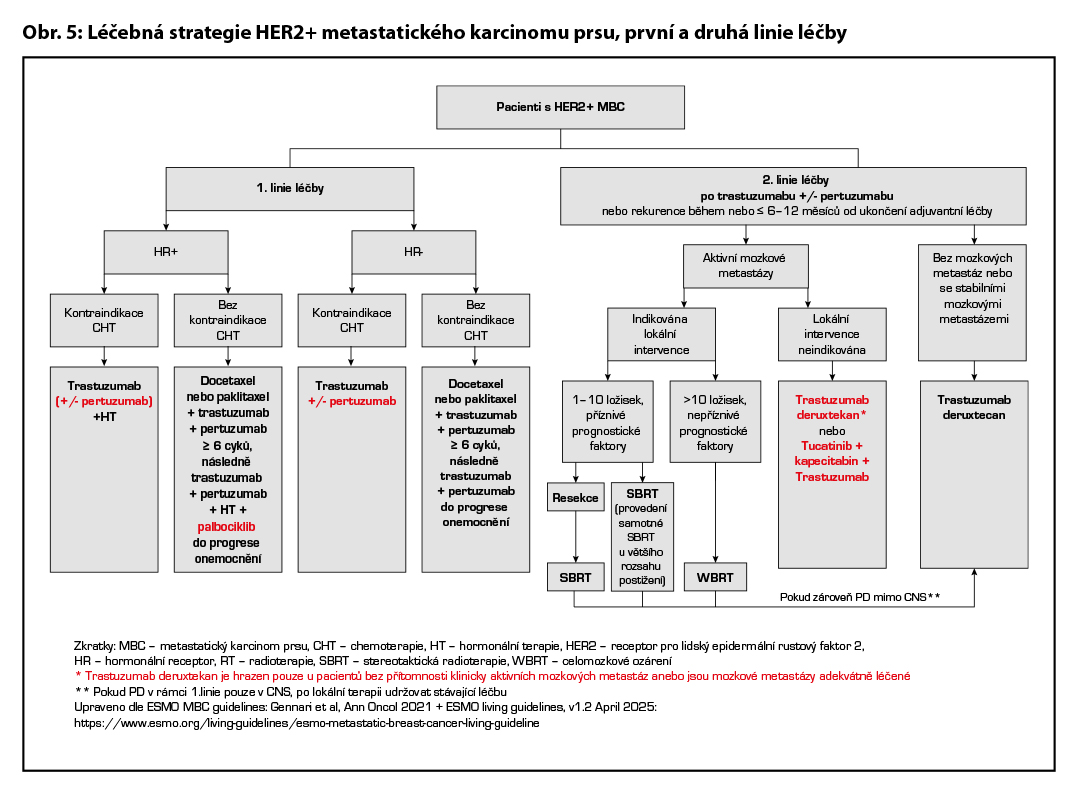 Všechny pacientky s HER2 pozitivním metastatickým karcinomem prsu by měly být léčeny anti-HER2 léčbou. Výjimkou jsou pouze ty pacientky, u kterých je anti-HER2 léčba kontraindikována. Po selhání první linie anti-HER2 léčby by měla být pacientce nabídnuta další linie anti-HER2 léčby (kontinuální anti-HER2 blokáda je zásadní k dosažení dlouhodobé kontroly onemocnění). Léčba je dlouhodobá, s přihlédnutím k benefitu a možným komplikacím. U pacientek s dlouhodobou remisí metastatického onemocnění (≥2 roky) je možným postupem přerušení/ukončení anti-HER2 léčby a sledování pacientky, deeskalace anti-HER2 léčby (např. T+P→T nebo T-DXd→T) nebo kontinuální pokračování v iniciálně voleném režimu do progrese/relapsu onemocnění.