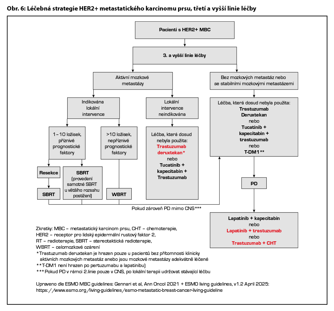 Volba terapie ve třetí a vyšších liniích léčby vždy závisí na léčbě v liniích předchozích, celkovém stavu pacientky i toxicitě předchozí léčby. Lze volit (dle předchozí léčby a přítomnosti aktivních mozkových metastáz) mezi léčbou kombinací tucatinib + kapecitabin + trastuzumab, T-DXd, T-DM1 (nemá úhradu po pertuzumabu a lapatinibu), případně pak lapatinib v kombinaci s kapecitabinem, lapatinibem v kombinaci s trastuzumabem či kombinací trastuzumabu s CHT . Po vyčerpání cílené HER2 blokády lze volit i samotnou CHT. Léčebná strategie metastatického HER2 pozitivního karcinomu prsu je zobrazena na Obr. 5 a Obr. 6.