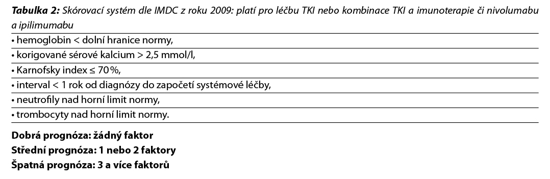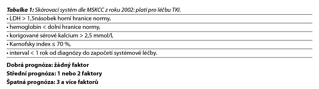 Pro léčbu v první linii cílené terapie multikinázovými inhibitory se používá skórovací systém dle MSKCC z roku 2002 (Motzer a kol. 2002) – tabulka 1 nebo dle IMDC (Heng a kol. 2009) – tabulka 2. Při použití kombinované terapie (TKI a checkpoint inhibitory, či nivolumabu a ipilimumabu) se používá skórování dle IMDC. Při stanovení prognostické kategorie je nutno dodržovat aktuální indikační omezení a způsob úhrady stanované SÚKL – úhrada může být vázána jen na MSKCC nebo jen na IMDC kritéria.