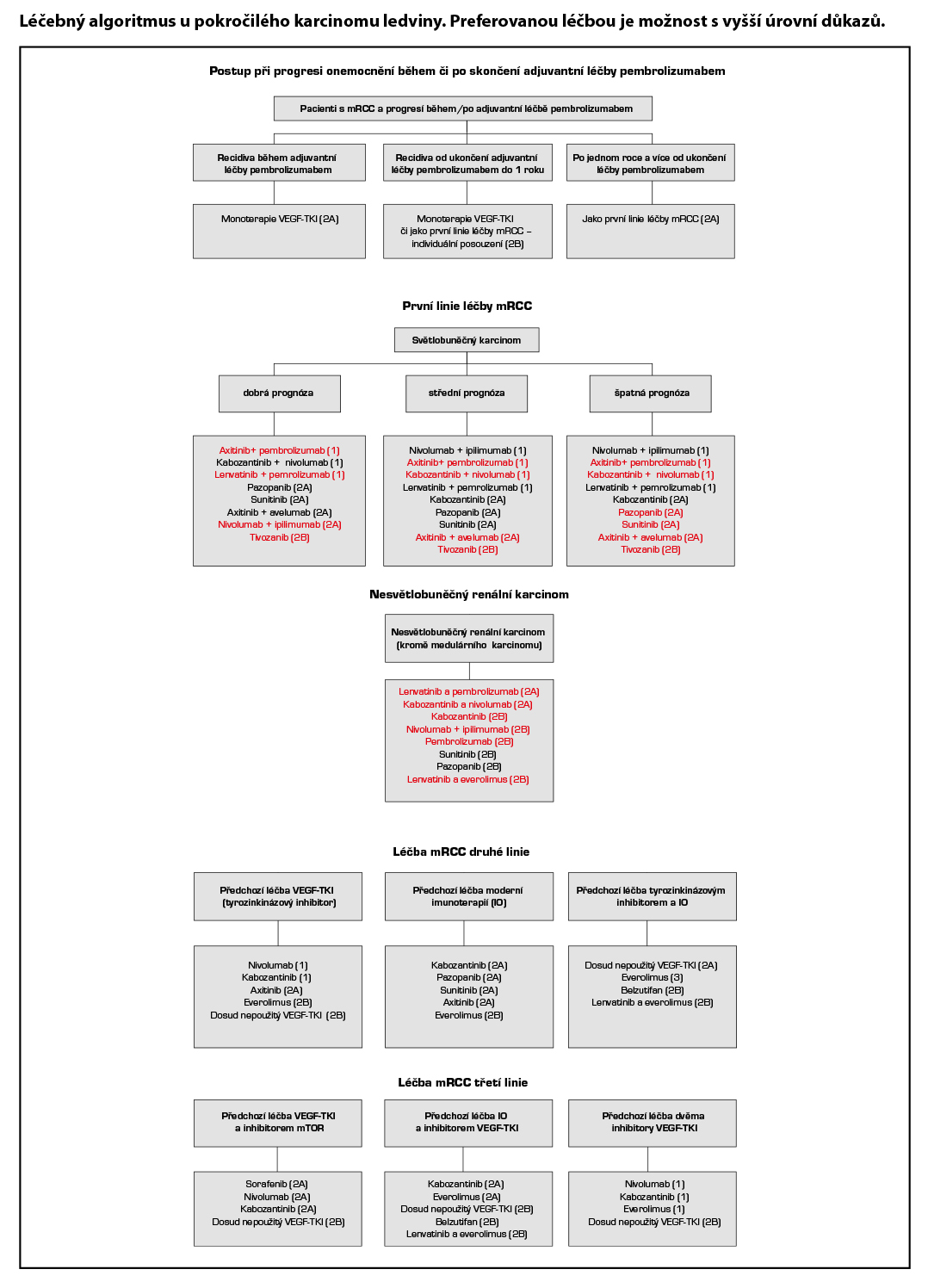 - U pacientů s nesvětlobuněčným pokročilým renálním karcinomem by měla být léčba individualizována dle podtypu, doporučené schéma v léčebném algoritmu je orientační a nelze aplikovat na všechny podtypy RCC. Pro vedení léčby doporučujeme sledovat např. NCCN či ESMO guidelines. Naprosto výjimečný přístup vyžadují především medulární renální karcinom a karcinom ze sběrných kanálků (léčba u karcinomu ze sběrných kanálků je založena především na chemoterapii).