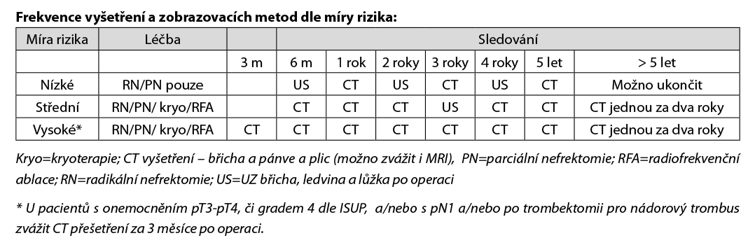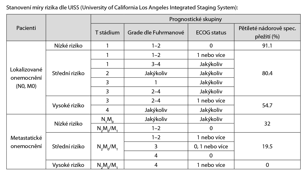 U pacientů s RCC provádíme skórování rizika rekurence dle nomogramů, následně dle stupně rizika se stanovuje frekvence kontrol a vyšetření, nejčastěji užíváme nomogramy: UISS či SSIGN. Níže je uvedená tabulka UISS, lze použít i on-line kalkulátory: www.mdcalc.com/ucla-integrated-staging-system-uiss-renal-cell-carcinoma-rcc