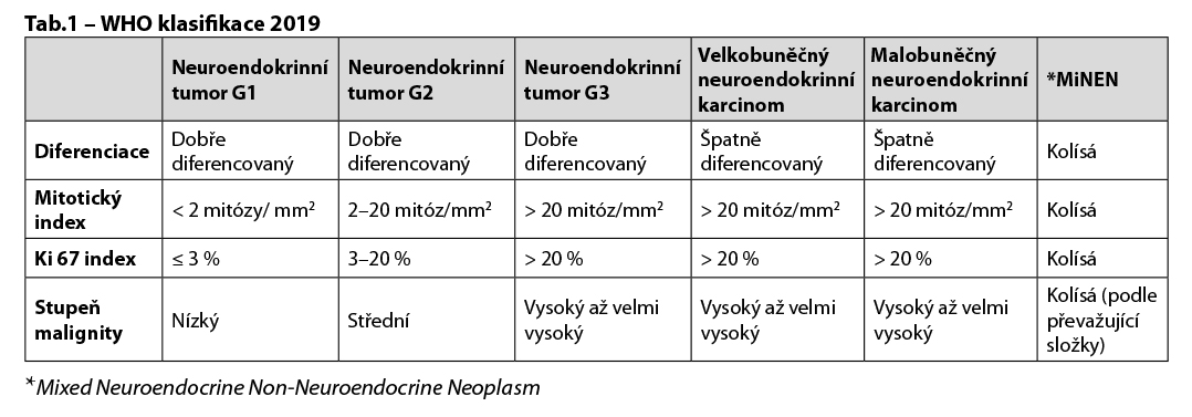 Gastroenteropankreatické neuroendokrinní nádory by měly být patologem zařazeny podle WHO klasifikace 2019 (Tab. 1). Kromě jiných změn byla posunuta arbitrární hranice mezi NET G1 a G2. NET G1 je nádor s Ki67 < 3 %.