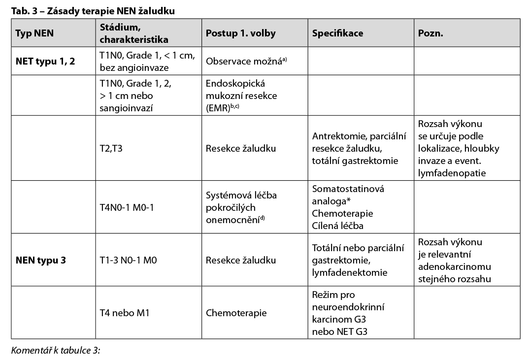 d) Léčba pokročilých stádií G-NET typu 1 a 2 podléhá standardům terapie NET ostatních lokalizací – tenkého a tlustého střeva, event. pankreatu. V léčbě metastazujících onemocnění se uplatňují somatostatinová analoga s předpokladem antiproliferativního efektu*. V dalších řadách terapie má efekt radioizotopová cílená terapie – PRRT (Peptide Receptor Radiation Therapy) a cílená biologická terapie (everolimus, kabozantinib).