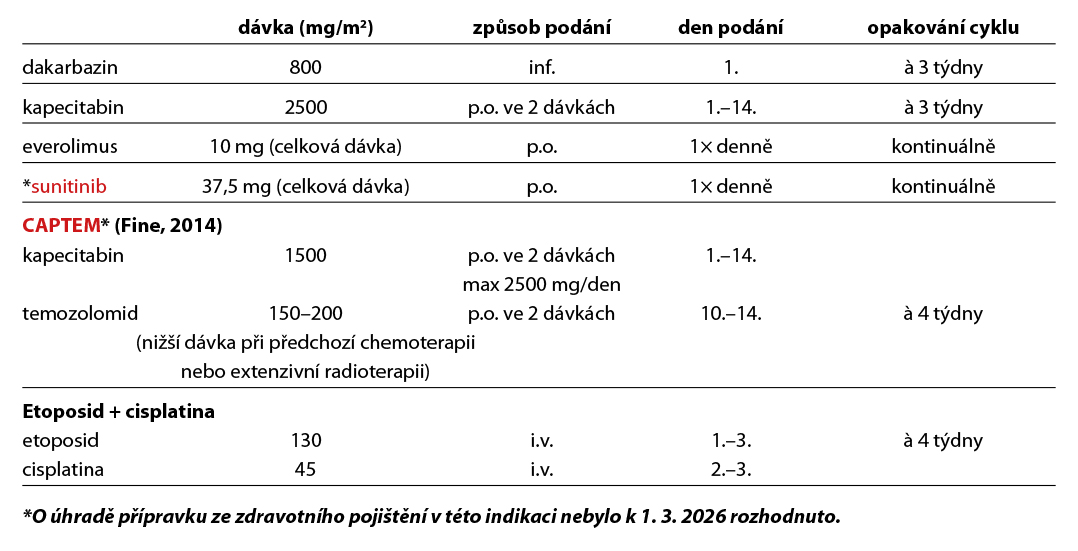 Dakarbazin, kapecitabin, temozolomid* a jejich kombinace. U NET pankreatu G1, G2 dobrá odpověď, RR 20–30 % (v některých souborech i více), medián OS 2 roky. U nádorů tenkého střeva horší výsledky, medián OS 11 měsíců. Chemoterapii rezervovat pouze pro rychle progredující nádory.