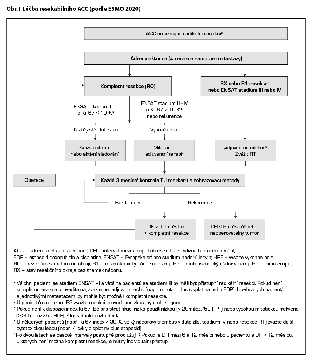 Adjuvantní radioterapie se zvažuje u pacientů s R1 nebo RX resekcí; ve stadiu III by měla být léčba zářením + mitotanem zvažována individuálně. (Obr. 1)