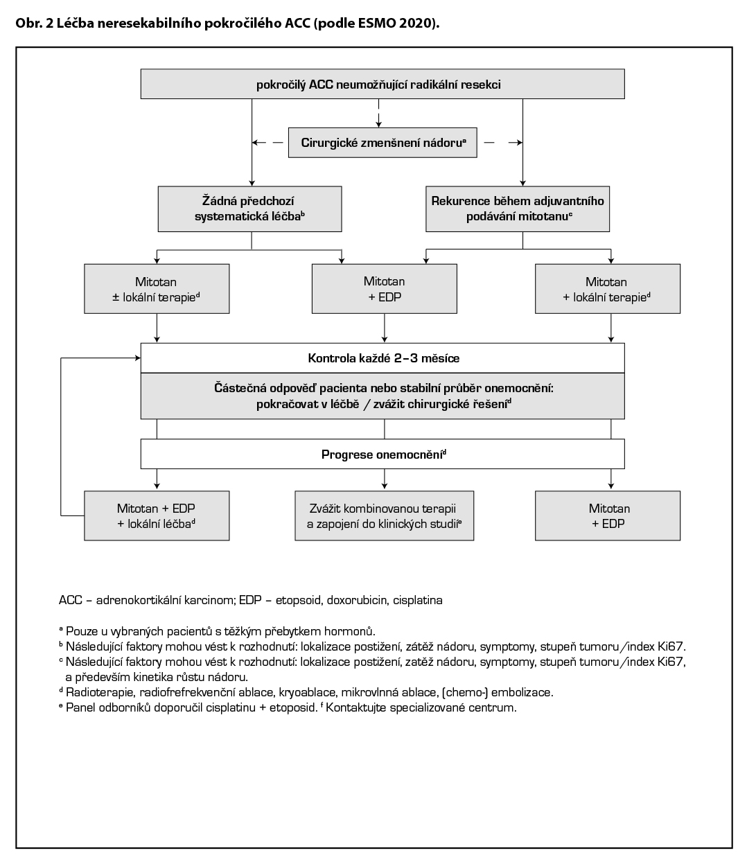 U pacientů s pokročilým ACC, kteří nejsou vhodní pro lokální léčbu, se doporučuje buď mitotanová monoterapie (která by měla být zahájena co nejdříve) nebo mitotan plus chemoterapie. EDP-M (etoposid, doxorubicin, cDDP, mitotan) je léčbou první volby. U vybraných pacientů (s nízkou nádorovou zátěží a/nebo indolentním onemocněním) je možná monoterapie mitotanem. Pokud je časový interval mezi poslední operací/lokální či regionální terapií a rekurencí kratší než 6 měsíců, doporučuje se mitotan + EDP (EDP-M) jako léčba první volby. Kromě chirurgického zákroku mají být zváženy i další lokoregionální metody. Rutinní používání operace nadledvin v případě rozšíření metastatického onemocnění se nedoporučuje (Obr. 2).