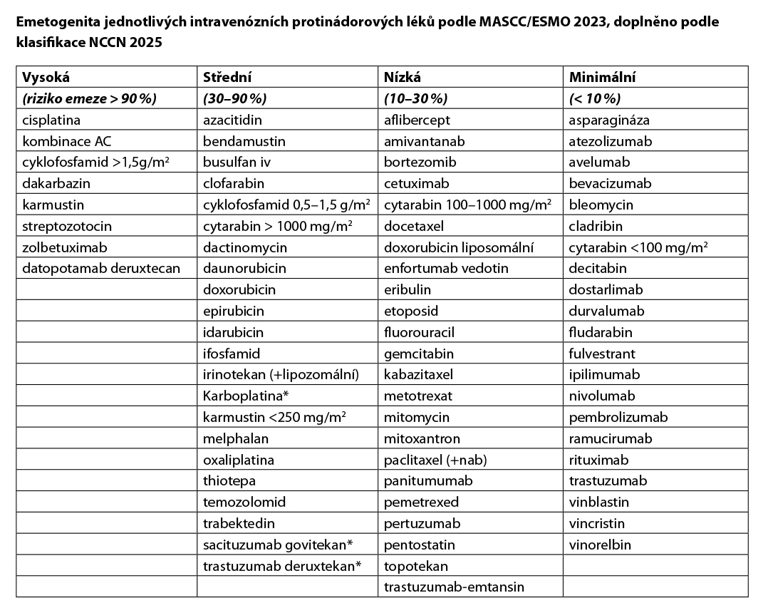 Klasifikace cytotoxických léků podle stupně emetogenity se poněkud liší podle různých zdrojů, prodělává určitý vývoj v čase a nemusí proto být definitivní. V našich podmínkách preferujeme společná guidelines mezinárodní a evropská, vypracovaná odbornými společnostmi MASCC a ESMO s poslední aktualizací v roce 2023, případně každoročně aktualizovaným guidelines NCCN.