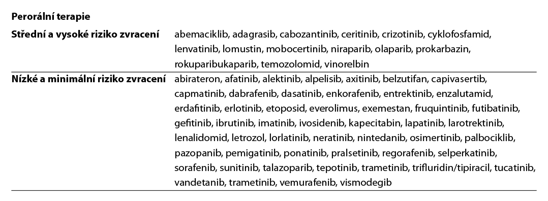 Emetogenita jednotlivých perorálních protinádorových léků podle MASCC/ESMO 2023, doplněno podle klasifikace NCCN 2025