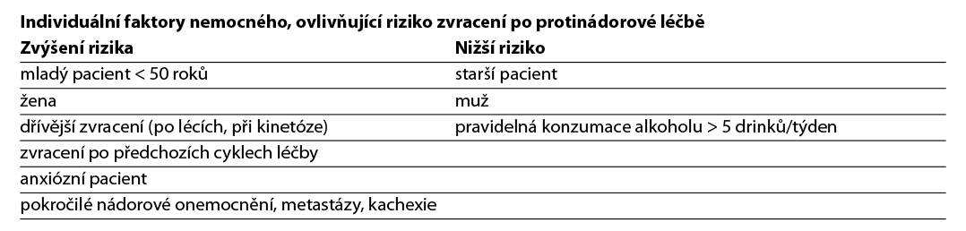 - emetogenita chemoterapie závisí také na individuálních faktorech nemocného, které jsou již zahrnovány do úvahy při rozhodování o antiemetické kombinaci léků.