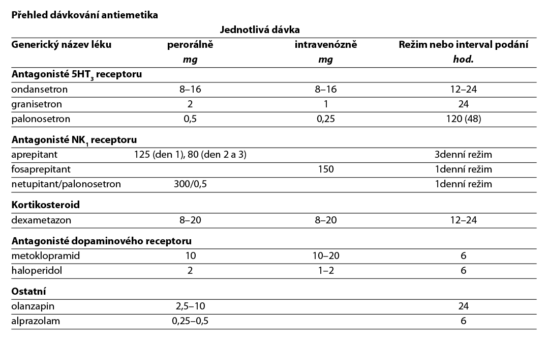 - profylakticky je doporučeno antiemetika podat 30–60 minut před zahájením chemoterapie