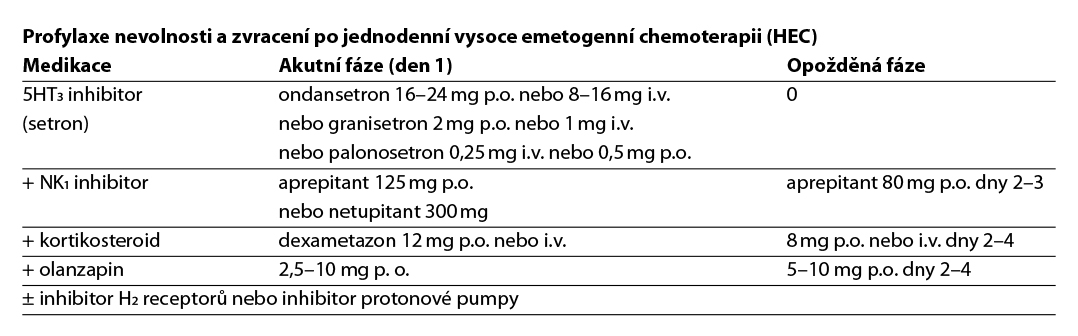 - čtyřkombinace setron + NK1 inhibitor + dexametazon + olanzapin je doporučený typ profylaxe od prvního cyklu HEC (i když aprepitant je hrazen až po selhání předchozí léčby)
