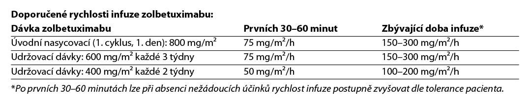 - Monoklonální protilátka zolbetuximab má vysoce emetogenní potenciál a k rozvoji zvracení a nauzey dochází již během její aplikace (podkladem je interakce s claudinem 18.2, který je vysoce exprimován v žaludeční sliznici). Proto se doporučuje již iniciálně použít profylakticky 4-kombinaci antiemetik. Současně se doporučuje upravit rychlost infuze dle následujícího doporučení.