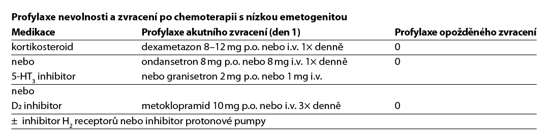 Při chemoterapii s minimální emetogenitou není u nemocných s negativní anamnézou doporučena rutinní profylaxe akutního ani opožděného zvracení.