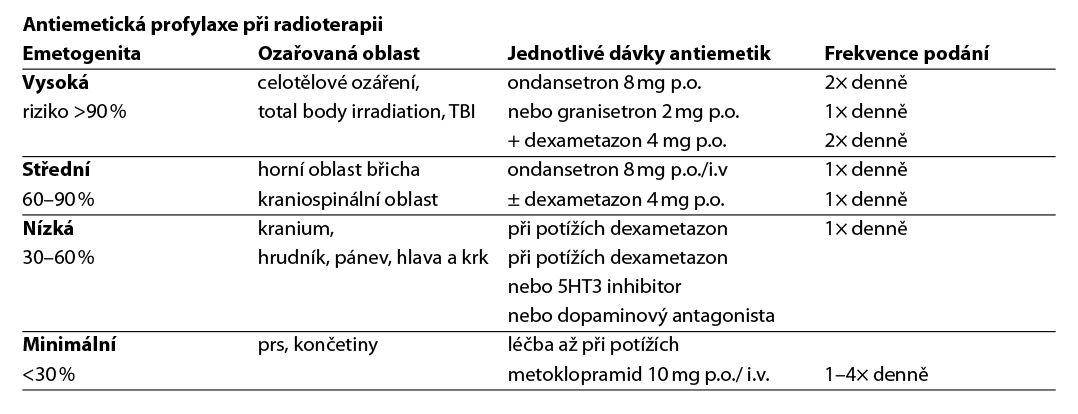 - při kombinaci radioterapie s chemoterapií je profylaxe podávána podle více emetogenní složky, většinou podle chemoterapie.
