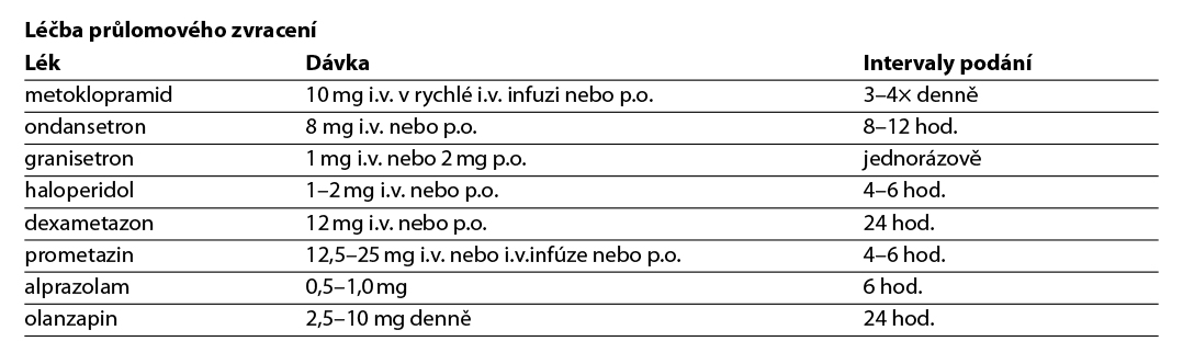 - lékař by měl zhodnotit, zda průlomové zvracení nemá jinou příčinu (nádorové postižení střeva, obstrukce střeva, mozkové metastázy, elektrolytové poruchy, gastroparéza, léčba opioidy a jiné)