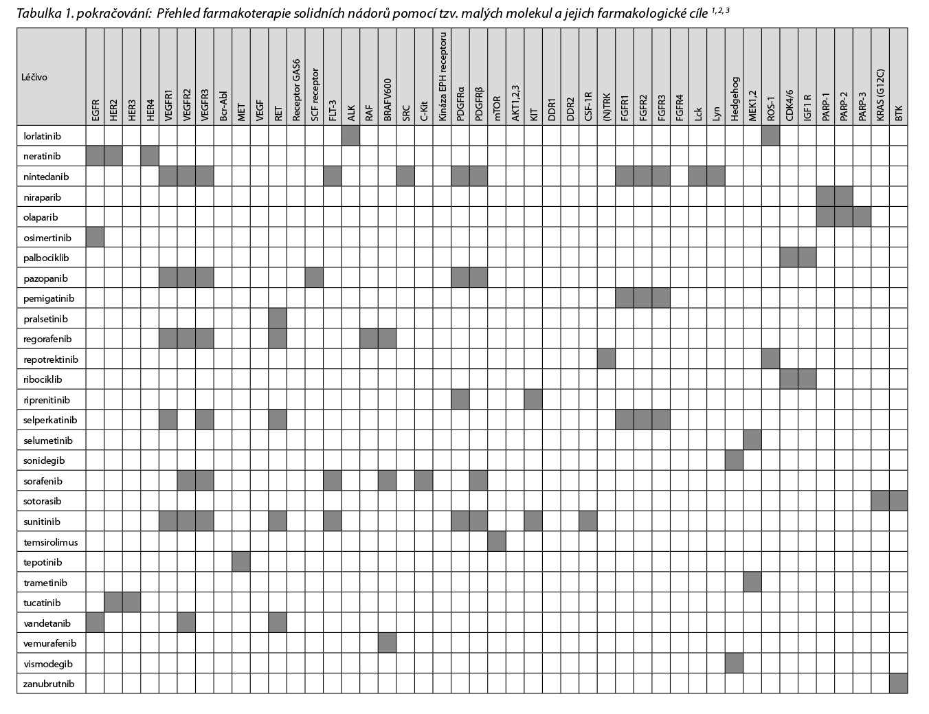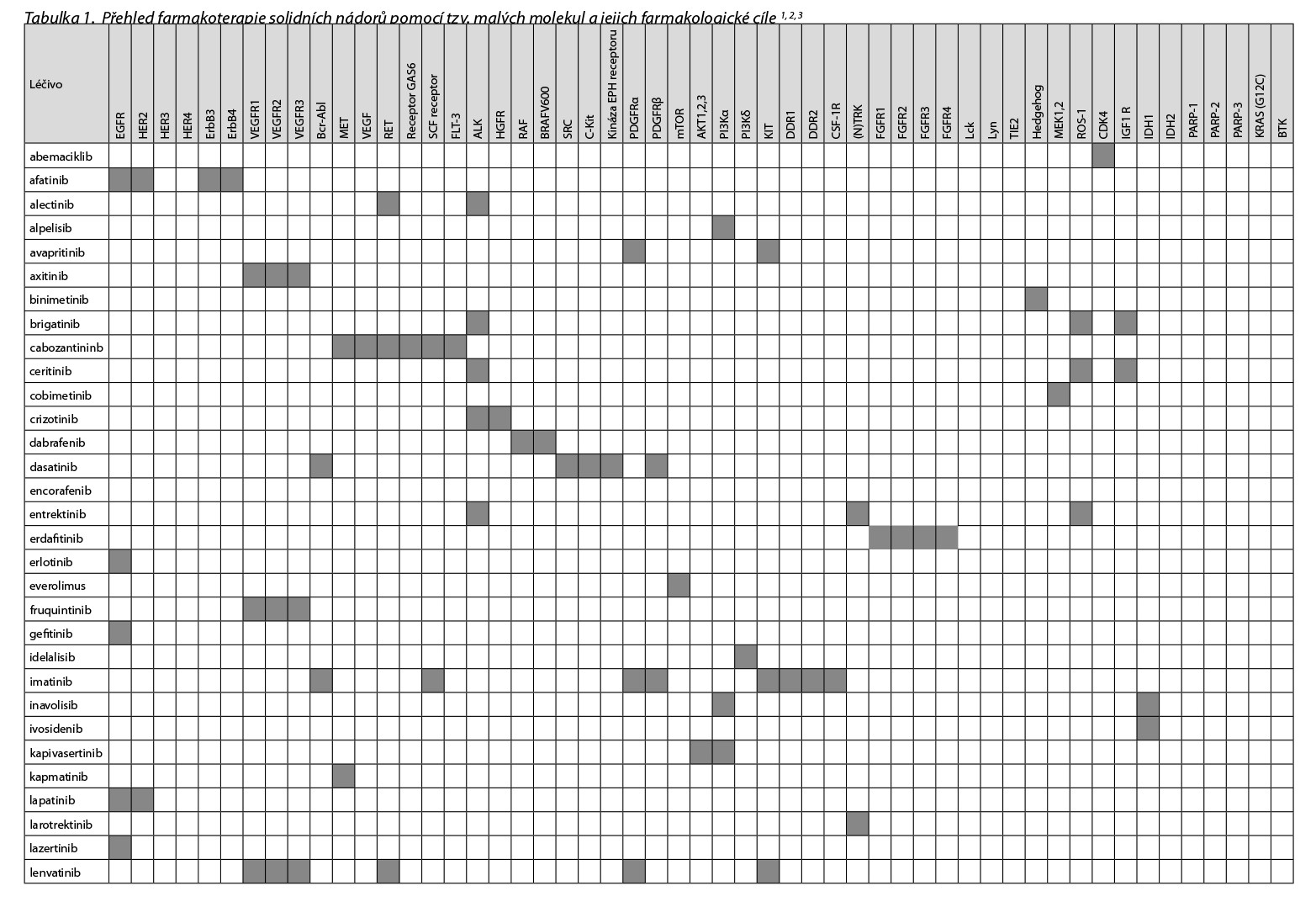 Přehled v Česku registrovaných léčiv skupiny tzv. cílené terapie malými molekulami a jejich cílových struktur uvádí následující tabulka.