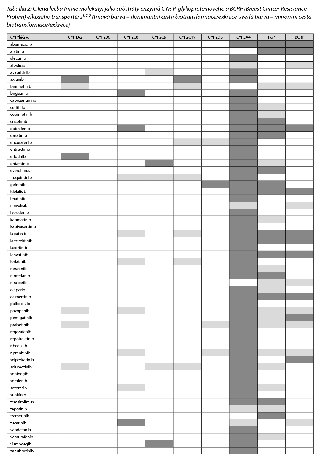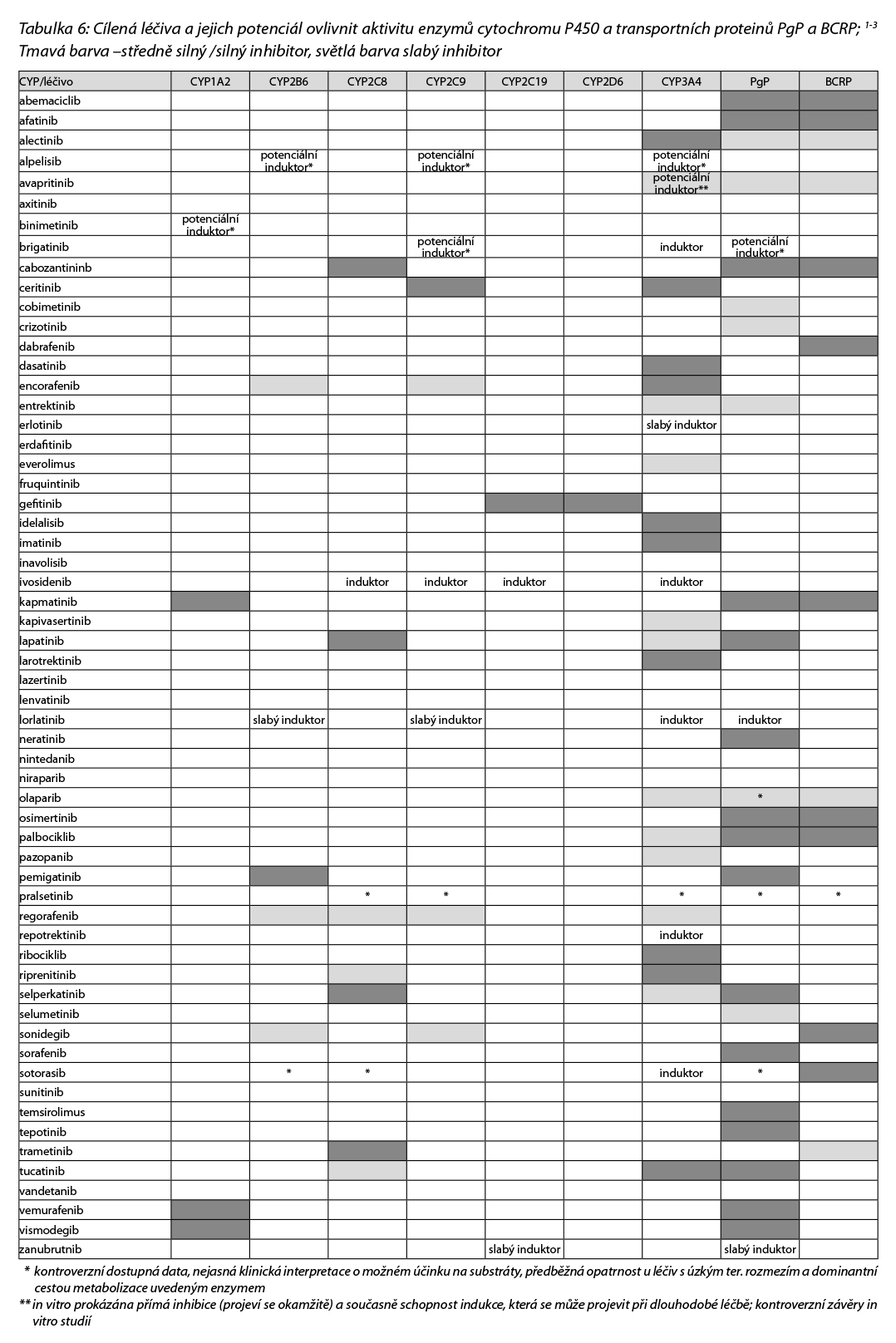 Nezanedbatelný je také potenciální vliv malých molekul na metabolismus jiných léčiv, protože mnohé kinázové inhibitory jsou klinicky významnými inhibitory biotransformačních enzymů a transportních proteinů. Tato inhibice pak může vyústit v toxicitu nebo četné nežádoucí účinky především u léčiv s úzkým terapeutickým oknem. Přehled léčiv (cílené léčby, malé molekuly) jako inhibitorů enzymů CYP a transportních proteinů BCRP a PgP uvádí Tabulka 6.